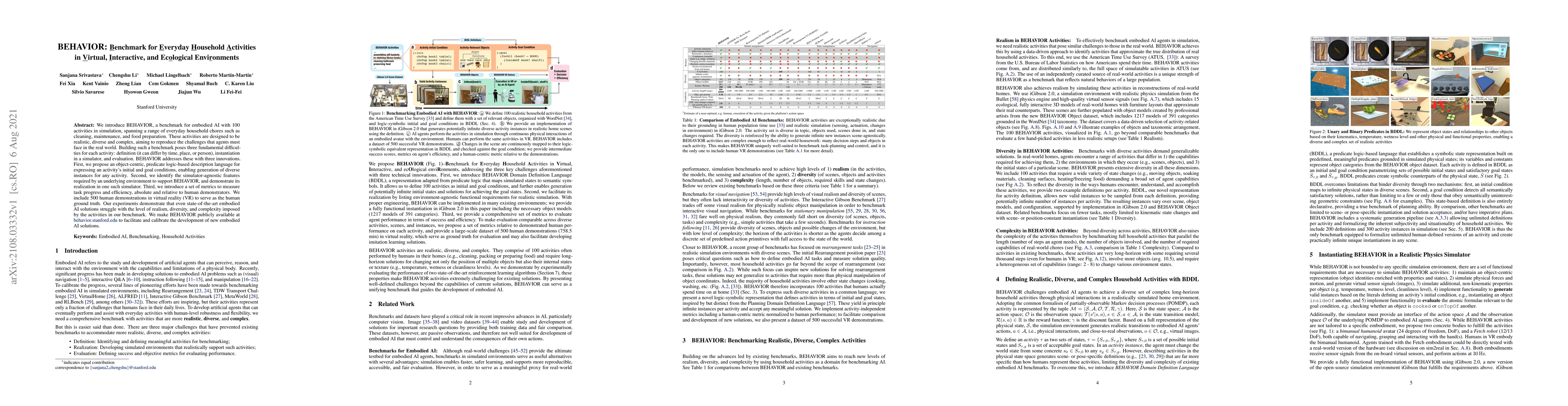 BEHAVIOR is a benchmark for embodied AI featuring 100 diverse, realistic household activities designed to challenge agents in simulating real-world tasks. It addresses difficulties in activity definition, instantiation, and evaluation through innovations in description languages, simulator-agnostic features, and performance metrics.