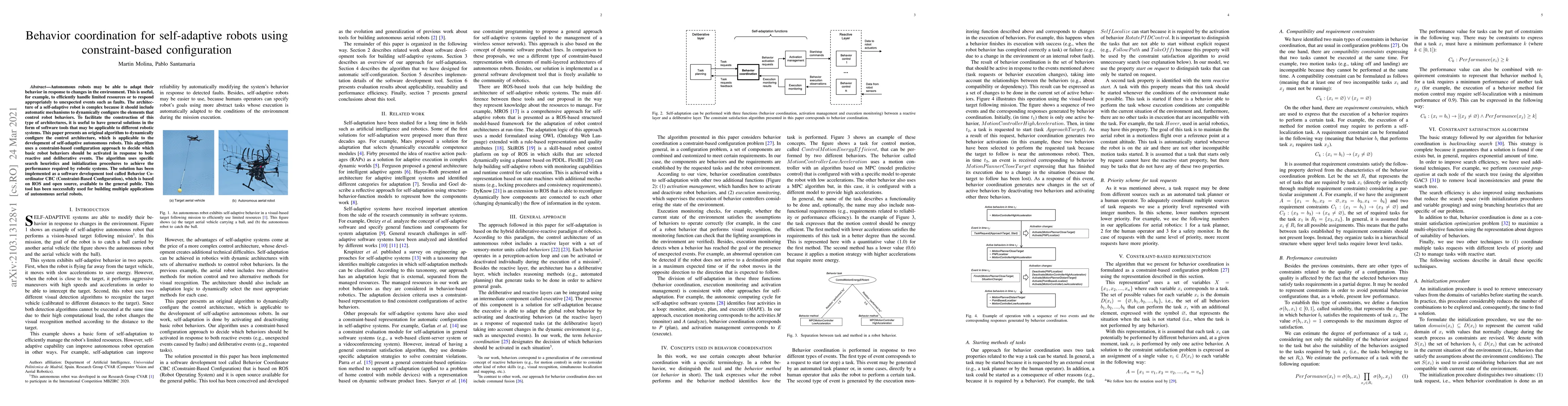 Autonomous robots may be able to adapt their behavior in response to changes in the environment. This is useful, for example, to efficiently handle limited resources or to respond appropriately to unexpected events such as faults. The architecture of a self-adaptive robot is complex because it should include automatic mechanisms to dynamically configure the elements that control robot behaviors. To facilitate the construction of this type of architectures, it is useful to have general solutions in the form of software tools that may be applicable to different robotic systems. This paper presents an original algorithm to dynamically configure the control architecture, which is applicable to the development of self-adaptive autonomous robots. This algorithm uses a constraint-based configuration approach to decide which basic robot behaviors should be activated in response to both reactive and deliberative events. The algorithm uses specific search heuristics and initialization procedures to achieve the performance required by robotic systems. The solution has been implemented as a software development tool called Behavior Coordinator CBC (Constraint-Based Configuration), which is based on ROS and open source, available to the general public. This tool has been successfully used for building multiple applications of autonomous aerial robots.