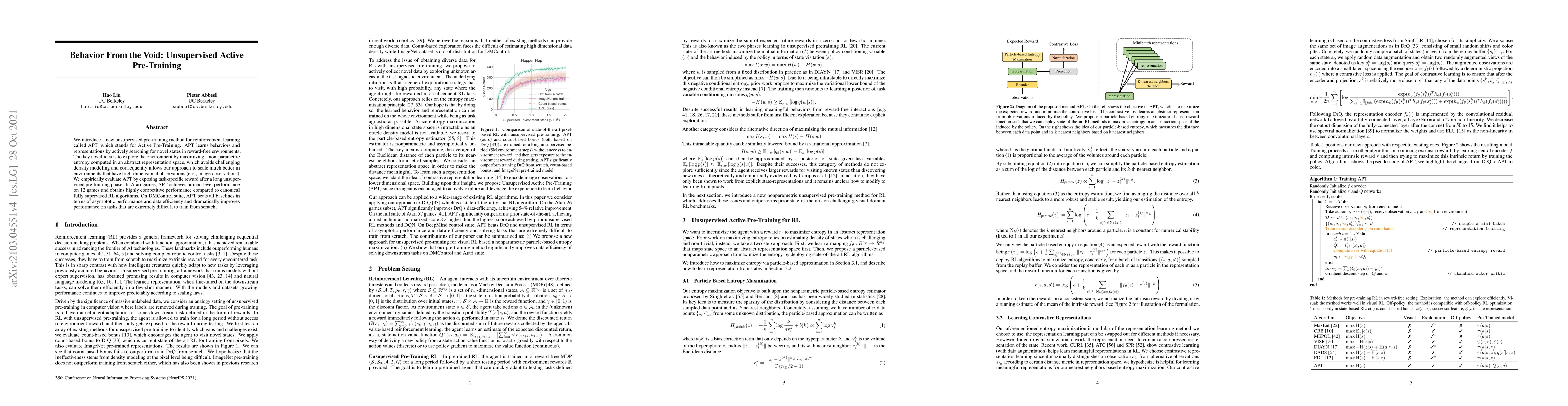 We introduce a new unsupervised pre-training method for reinforcement learning called APT, which stands for Active Pre-Training. APT learns behaviors and representations by actively searching for novel states in reward-free environments. The key novel idea is to explore the environment by maximizing a non-parametric entropy computed in an abstract representation space, which avoids challenging density modeling and consequently allows our approach to scale much better in environments that have high-dimensional observations (e.g., image observations). We empirically evaluate APT by exposing task-specific reward after a long unsupervised pre-training phase. In Atari games, APT achieves human-level performance on 12 games and obtains highly competitive performance compared to canonical fully supervised RL algorithms. On DMControl suite, APT beats all baselines in terms of asymptotic performance and data efficiency and dramatically improves performance on tasks that are extremely difficult to train from scratch.