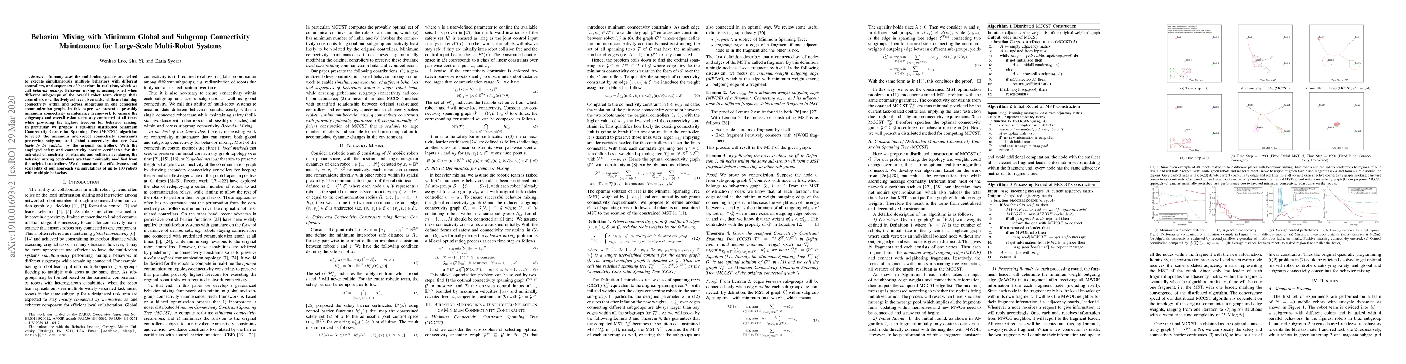 This paper proposes a framework for maintaining minimum global and subgroup connectivity in large-scale multi-robot systems during behavior mixing. The authors introduce a real-time distributed Minimum Connectivity Constraint Spanning Tree (MCCST) algorithm to ensure connectivity while minimally modifying original controllers.