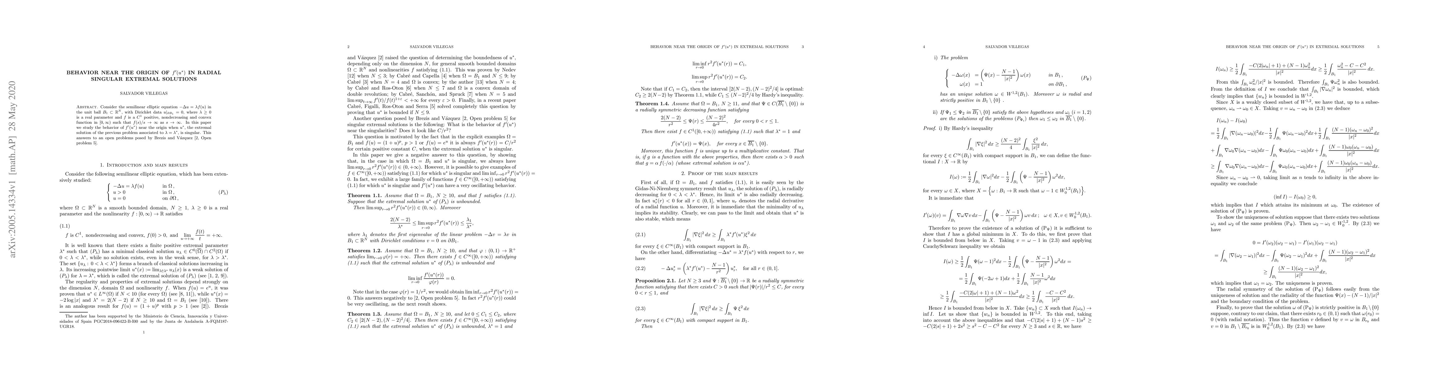 Consider the semilinear elliptic equation $-\Delta u=\lambda f(u)$ in the unit ball $B_1\subset \mathbb{R}^N$, with Dirichlet data $u|_{\partial B_1}=0$, where $\lambda\geq 0$ is a real parameter and $f$ is a $C^1$ positive, nondecreasing and convex function in $[0,\infty)$ such that $f(s)/s\rightarrow\infty$ as $s\rightarrow\infty$. In this paper we study the behavior of $f'(u^\ast)$ near the origin when $u^\ast$, the extremal solution of the previous problem associated to $\lambda=\lambda^\ast$, is singular. This answers to an open problems posed by Brezis and V\'azquez.