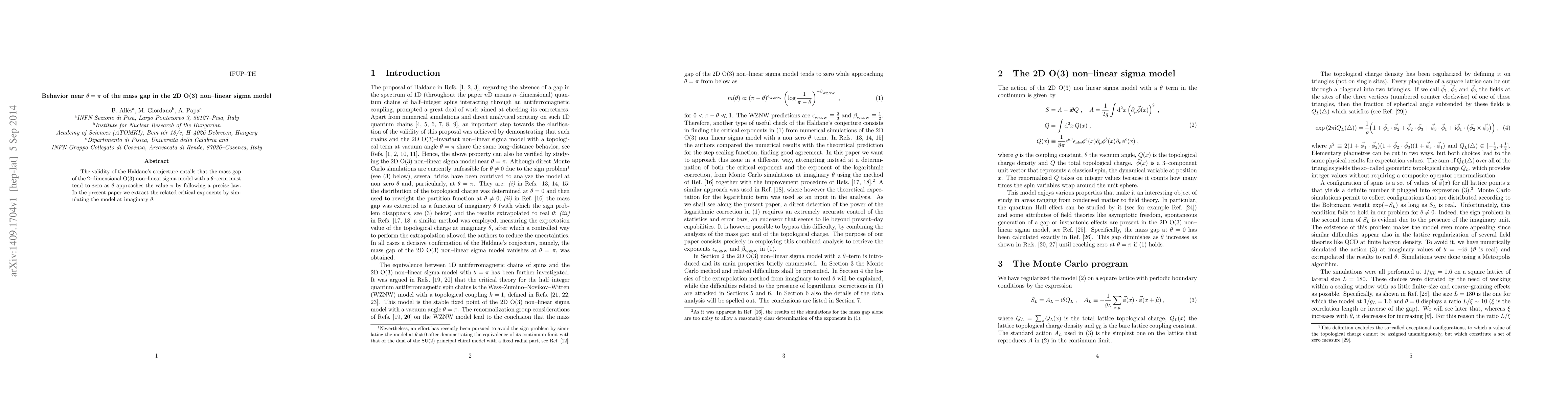 This paper investigates the behavior of the mass gap in the 2D O(3) non-linear sigma model near $\theta = \pi$ and confirms the precise law predicted by Haldane's conjecture through simulations at imaginary $\theta$, extracting the relevant critical exponents.