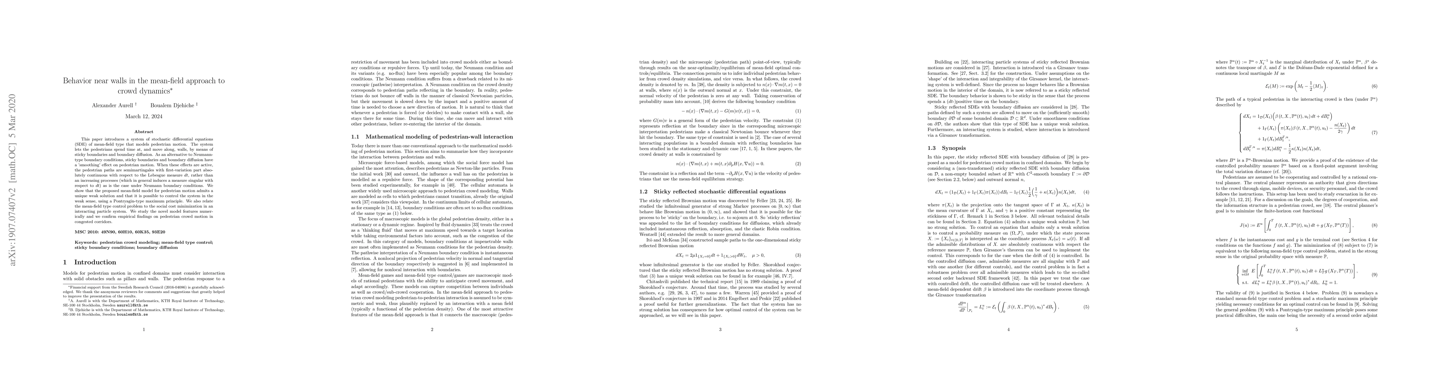 A new model for pedestrian motion near walls uses sticky boundaries and boundary diffusion to smooth out motion, reducing complexity and allowing control of the system. The model's unique features can be controlled in a weak sense using Pontryagin-type maximum principle and relate to social cost minimization.