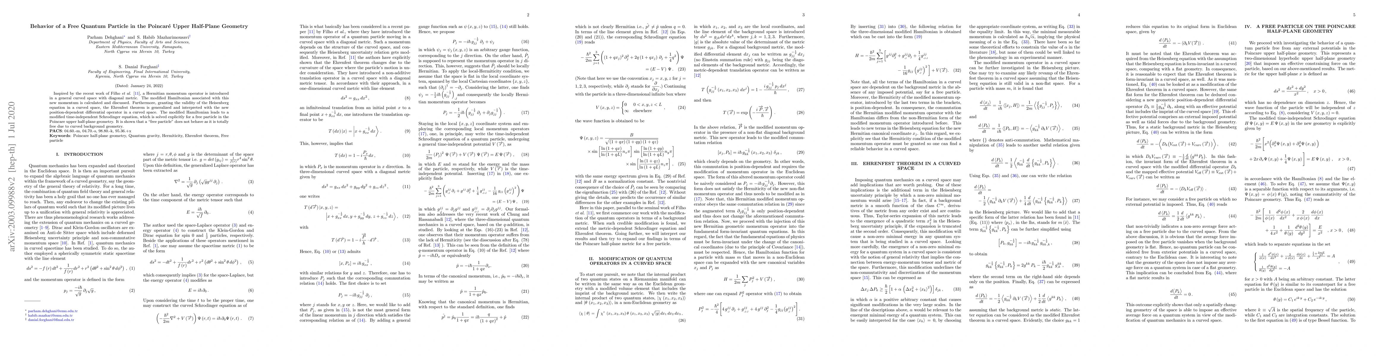 This paper introduces a Hermitian momentum operator in a curved space with diagonal metric, modifies the Hamiltonian, and generalizes the Ehrenfest theorem. It solves the modified time-independent Schrödinger equation for a free quantum particle in the Poincaré upper half-plane, revealing that the particle's behavior is influenced by the curved geometry.