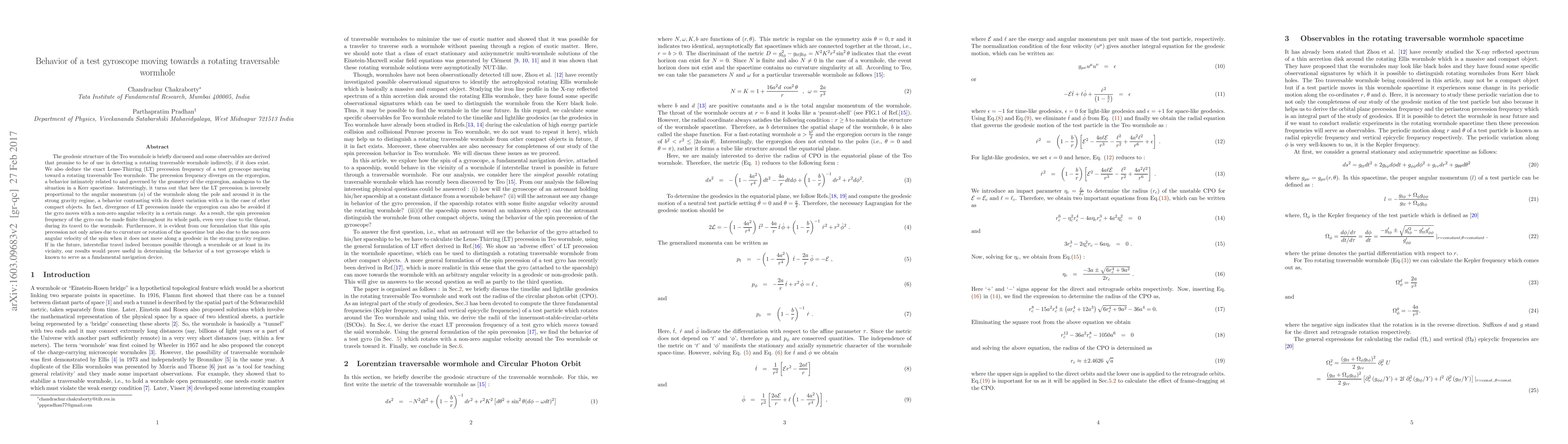The geodesic structure of the Teo wormhole is briefly discussed and some observables are derived that promise to be of use in detecting a rotating traversable wormhole indirectly, if it does exist. We also deduce the exact Lense-Thirring (LT) precession frequency of a test gyroscope moving toward a rotating traversable Teo wormhole. The precession frequency diverges on the ergoregion, a behavior intimately related to and governed by the geometry of the ergoregion, analogous to the situation in a Kerr spacetime. Interestingly, it turns out that here the LT precession is inversely proportional to the angular momentum ($a$) of the wormhole along the pole and around it in the strong gravity regime, a behavior contrasting with its direct variation with $a$ in the case of other compact objects. In fact, divergence of LT precession inside the ergoregion can also be avoided if the gyro moves with a non-zero angular velocity in a certain range. As a result, the spin precession frequency of the gyro can be made finite throughout its whole path, even very close to the throat, during its travel to the wormhole. Furthermore, it is evident from our formulation that this spin precession not only arises due to curvature or rotation of the spacetime but also due to the non-zero angular velocity of the spin when it does not move along a geodesic in the strong gravity regime. If in the future, interstellar travel indeed becomes possible through a wormhole or at least in its vicinity, our results would prove useful in determining the behavior of a test gyroscope which is known to serve as a fundamental navigation device.