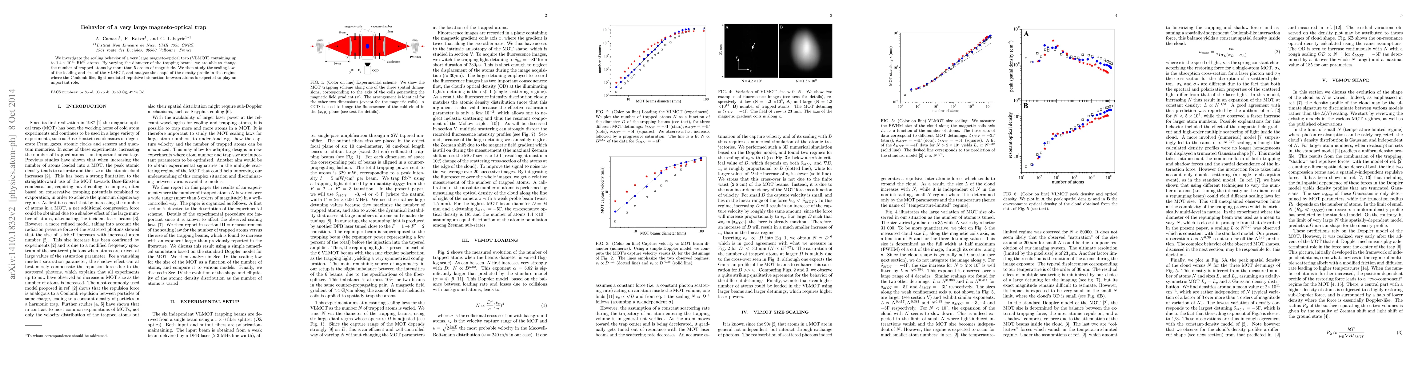 We investigate the scaling behavior of a very large magneto-optical trap (VLMOT) containing up to $1.4 \times 10^{11}$ Rb$^{87}$ atoms. By varying the diameter of the trapping beams, we are able to change the number of trapped atoms by more than 5 orders of magnitude. We then study the scaling laws of the loading and size of the VLMOT, and analyze the shape of the density profile in this regime where the Coulomb-like, light-mediated repulsive interaction between atoms is expected to play an important role.