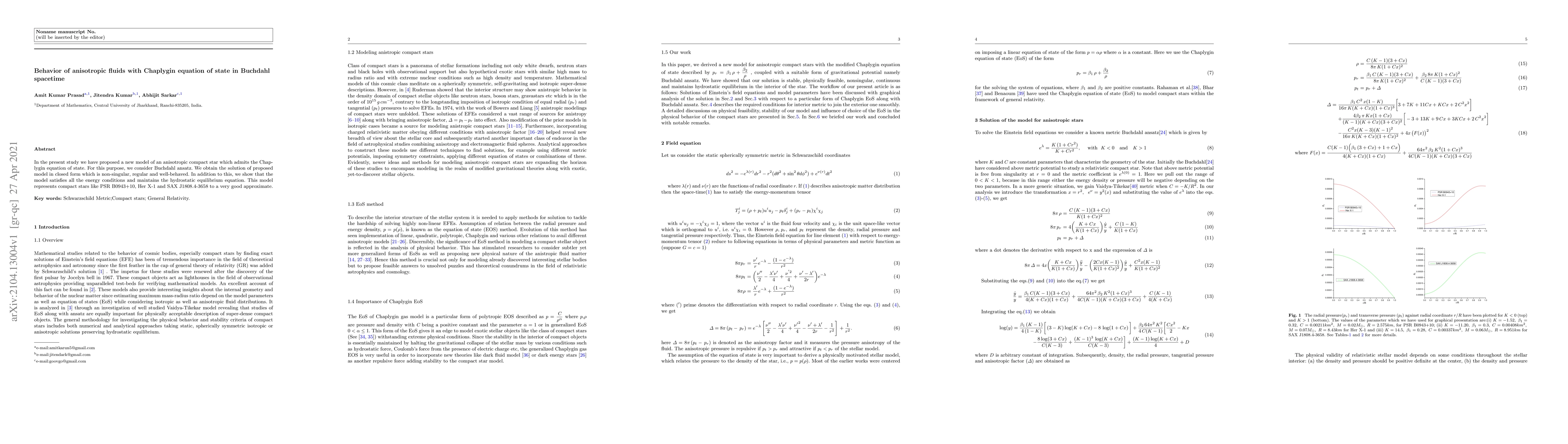 This paper proposes a new model for anisotropic compact stars using the Chaplygin equation of state within Buchdahl spacetime, obtaining a non-singular, regular solution that satisfies energy conditions and hydrostatic equilibrium. The model accurately represents compact stars like PSR B0943+10, Her X-1, and SAX J1808.4-3658.