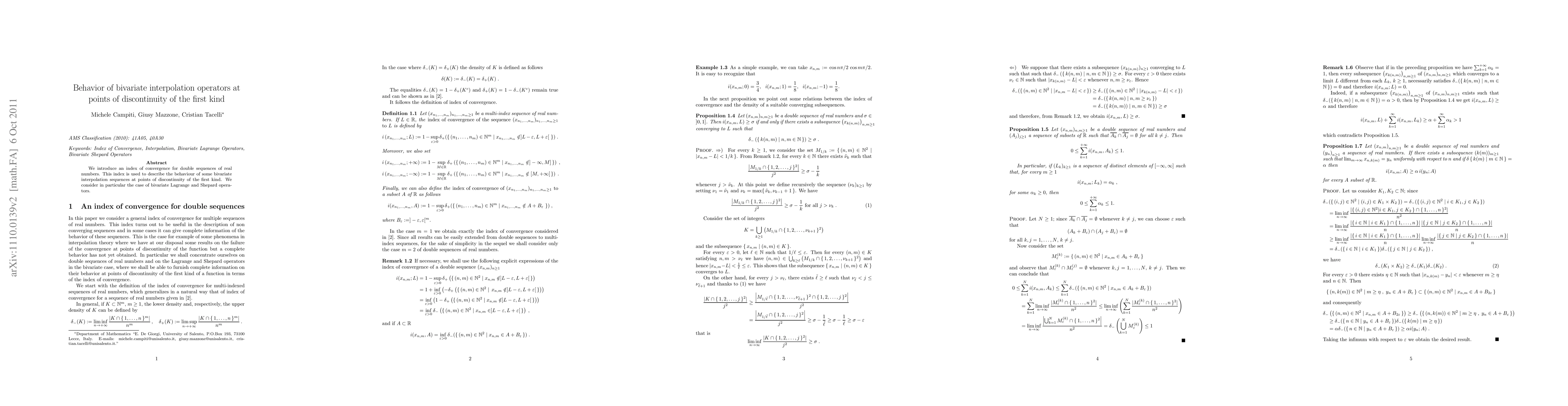 We introduce an index of convergence for double sequences of real numbers. This index is used to describe the behaviour of some bivariate interpolation sequences at points of discontinuity of the first kind. We consider in particular the case of bivariate Lagrange and Shepard operators.