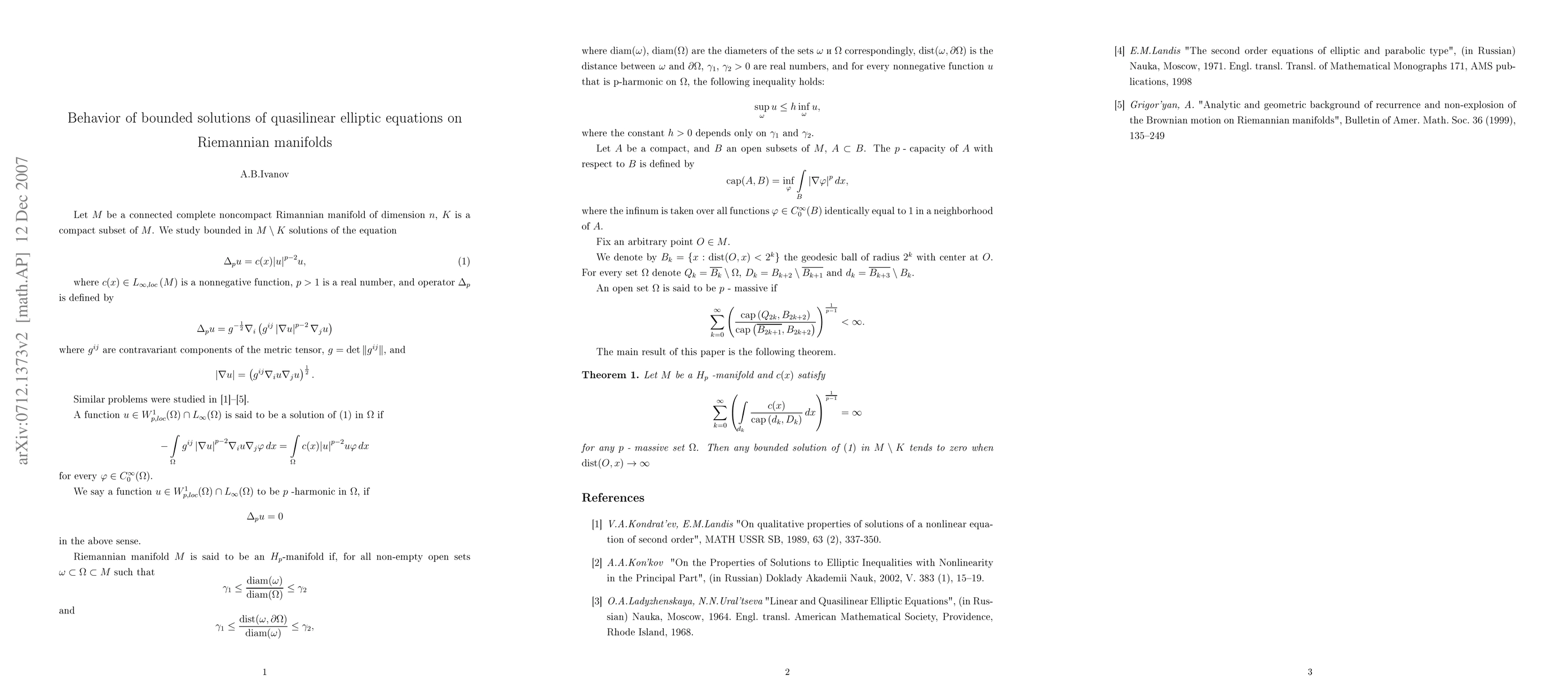 Summary: This paper investigates bounded solutions of quasilinear elliptic equations on Riemannian manifolds under specific conditions, exploring their behavior and properties.