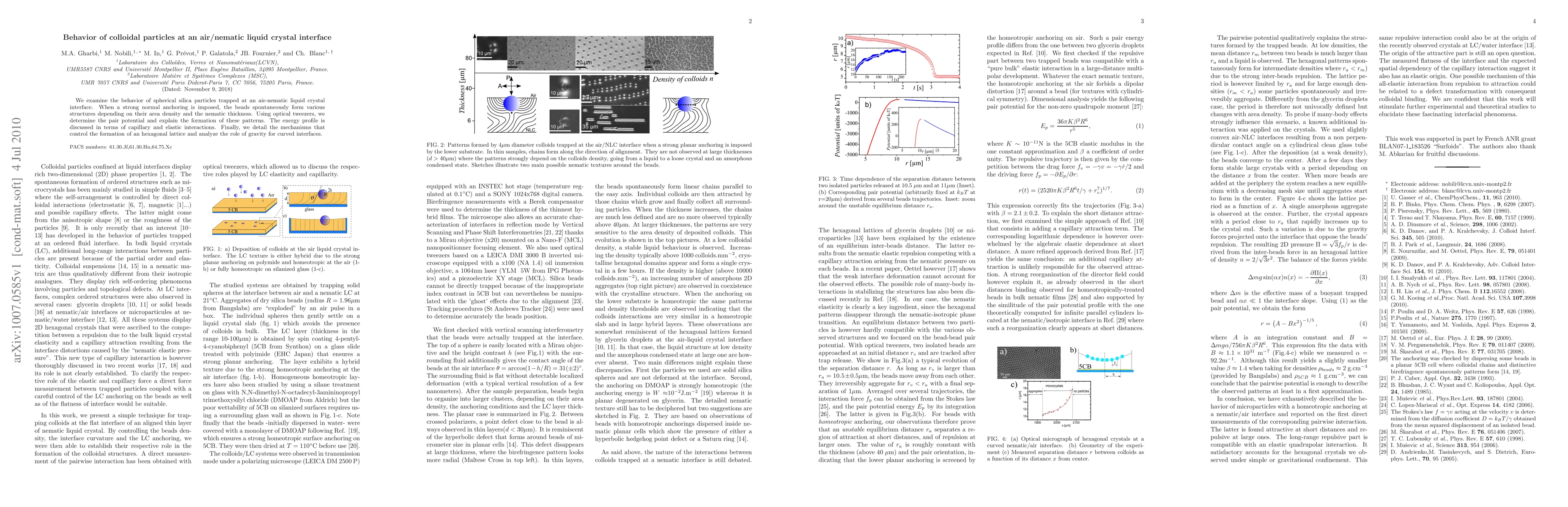 This study investigates how spherical silica particles behave at an air-nematic liquid crystal interface, revealing that they form diverse structures based on density and liquid crystal thickness. The research uses optical tweezers to determine the pair potential and explains pattern formation through capillary and elastic interactions, focusing on the hexagonal lattice formation and the influence of gravity on curved interfaces.