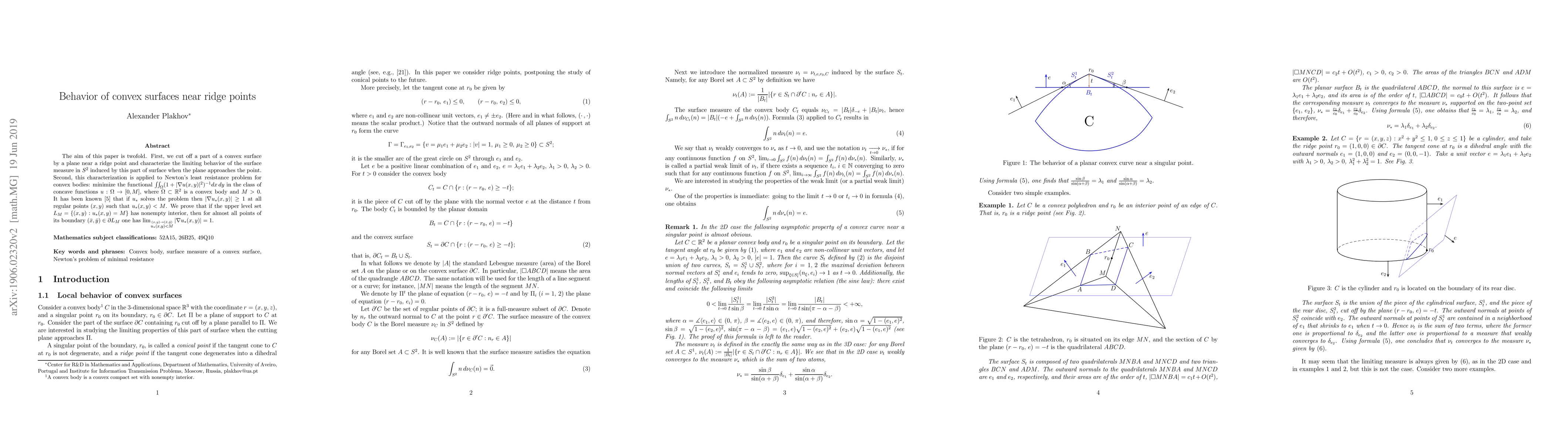 This paper explores the behavior of convex surfaces near ridge points, characterizing surface measure limiting behavior when a plane approaches a ridge. This is then applied to Newton's least resistance problem for convex bodies, proving that for almost all boundary points of the lower level set where the gradient limit exists, the gradient approaches 1. This work contributes to understanding surface properties and optimization problems in physics and engineering.