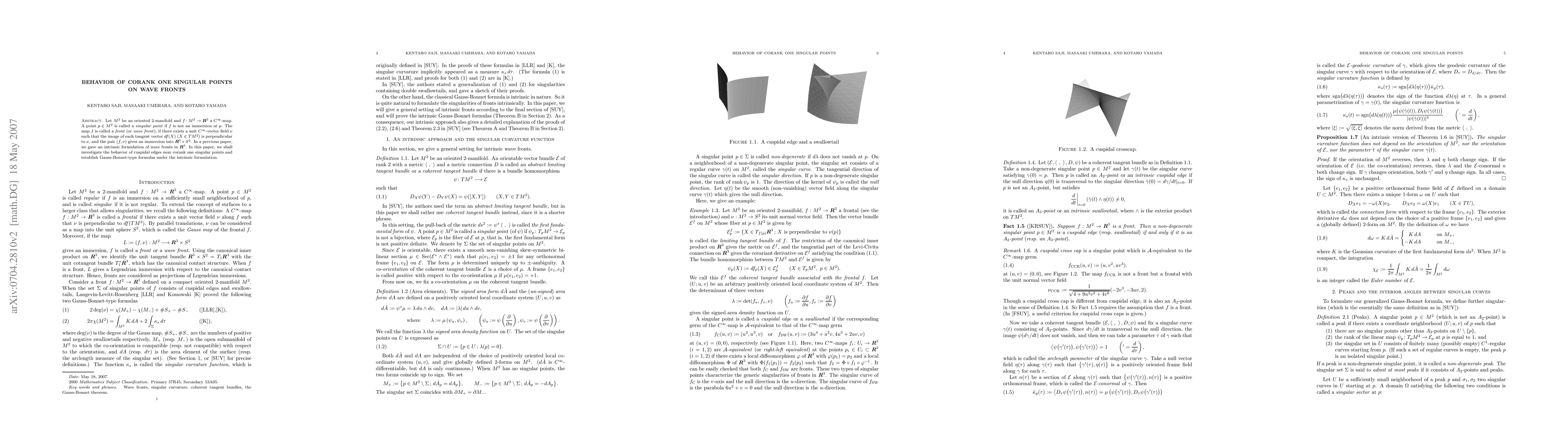 This paper investigates the behavior of corank one singular points on wave fronts in 2-manifolds, establishing Gauss-Bonnet-type formulas for intrinsic formulation.