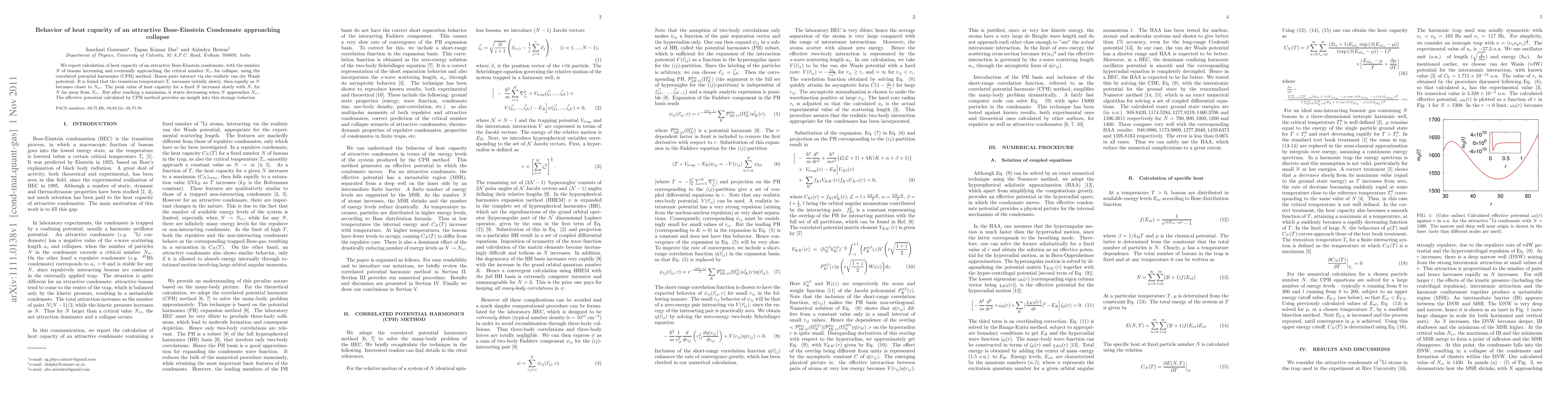 This study calculates the heat capacity of an attractive Bose-Einstein condensate as the number of bosons approaches its critical collapse point using the correlated potential harmonics method. The transition temperature increases rapidly near the critical number, and the peak heat capacity initially rises slowly but then decreases as collapse is approached, revealing unique insights from the effective potential.