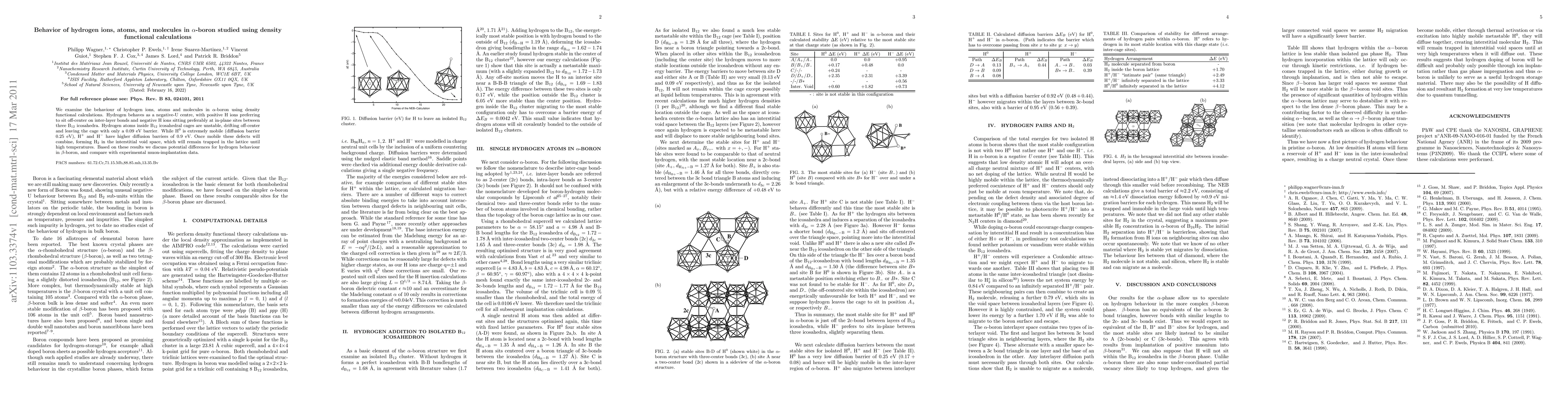 We examine the behaviour of hydrogen ions, atoms and molecules in alpha-boron using density functional calculations. Hydrogen behaves as a negative-U centre, with positive H ions preferring to sit off-center on inter-layer bonds and negative H ions sitting preferably at in-plane sites between three B12 icosahedra. Hydrogen atoms inside B12 icosahedral cages are unstable, drifting off-center and leaving the cage with only a 0.09 eV barrier. While H0 is extremely mobile (diffusion barrier 0.25 eV), H+ and H- have higher diffusion barriers of 0.9 eV. Once mobile these defects will combine, forming H2 in the interstitial void space, which will remain trapped in the lattice until high temperatures. Based on these results we discuss potential differences for hydrogen behaviour in beta-boron, and compare with experimental muon-implantation data.