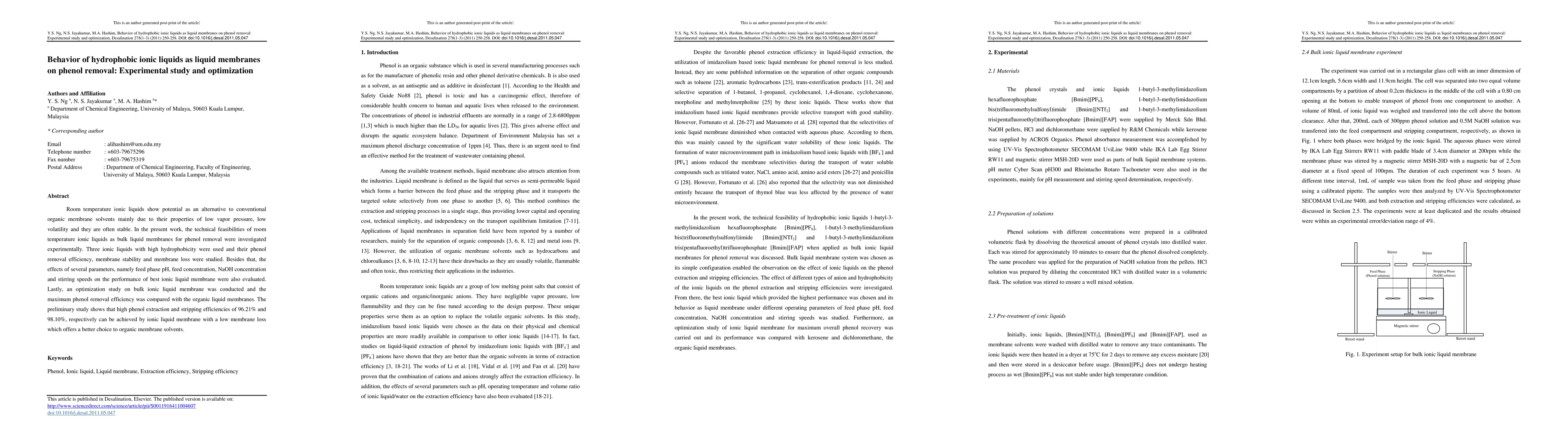 Room temperature ionic liquids show potential as an alternative to conventional organic membrane solvents mainly due to their properties of low vapor pressure, low volatility and they are often stable. In the present work, the technical feasibilities of room temperature ionic liquids as bulk liquid membranes for phenol removal were investigated experimentally. Three ionic liquids with high hydrophobicity were used and their phenol removal efficiency, membrane stability and membrane loss were studied. Besides that, the effects of several parameters, namely feed phase pH, feed concentration, NaOH concentration and stirring speeds on the performance of best ionic liquid membrane were also evaluated. Lastly, an optimization study on bulk ionic liquid membrane was conducted and the maximum phenol removal efficiency was compared with the organic liquid membranes. The preliminary study shows that high phenol extraction and stripping efficiencies of 96.21% and 98.10%, respectively can be achieved by ionic liquid membrane with a low membrane loss which offers a better choice to organic membrane solvents.