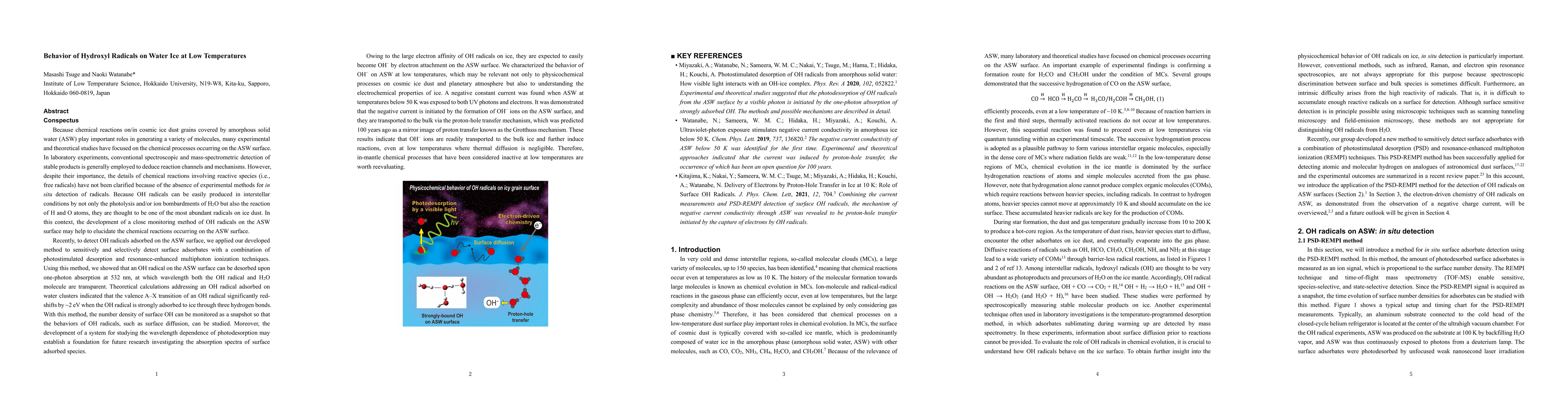Because chemical reactions on/in cosmic ice dust grains covered by amorphous solid water (ASW) play important roles in generating a variety of molecules, many experimental and theoretical studies have focused on the chemical processes occurring on the ASW surface. In laboratory experiments, conventional spectroscopic and mass-spectrometric detection of stable products is generally employed to deduce reaction channels and mechanisms. However, despite their importance, the details of chemical reactions involving reactive species (i.e., free radicals) have not been clarified because of the absence of experimental methods for in situ detection of radicals. Because OH radicals can be easily produced in interstellar conditions by not only the photolysis and/or ion bombardments of H2O but also the reaction of H and O atoms, they are thought to be one of the most abundant radicals on ice dust. In this context, the development of a close monitoring method of OH radicals on the ASW surface may help to elucidate the chemical reactions occurring on the ASW surface.