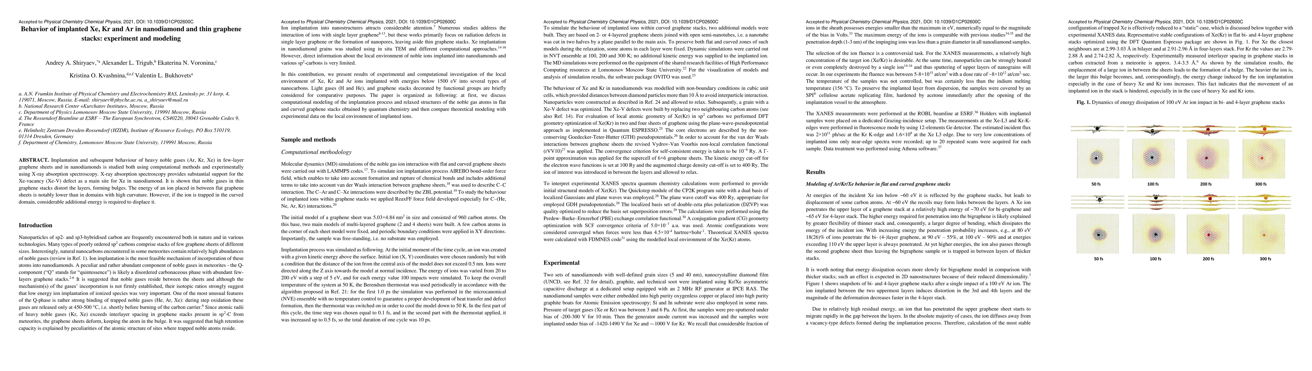 This study investigates the implantation and behavior of noble gases (Ar, Kr, Xe) in nanodiamonds and few-layer graphene using both computational modeling and X-ray absorption spectroscopy. The results indicate that Xe primarily forms Xe-vacancy defects in nanodiamonds, while noble gases distort graphene layers into bulges, with ions requiring more energy to displace from curved domains.