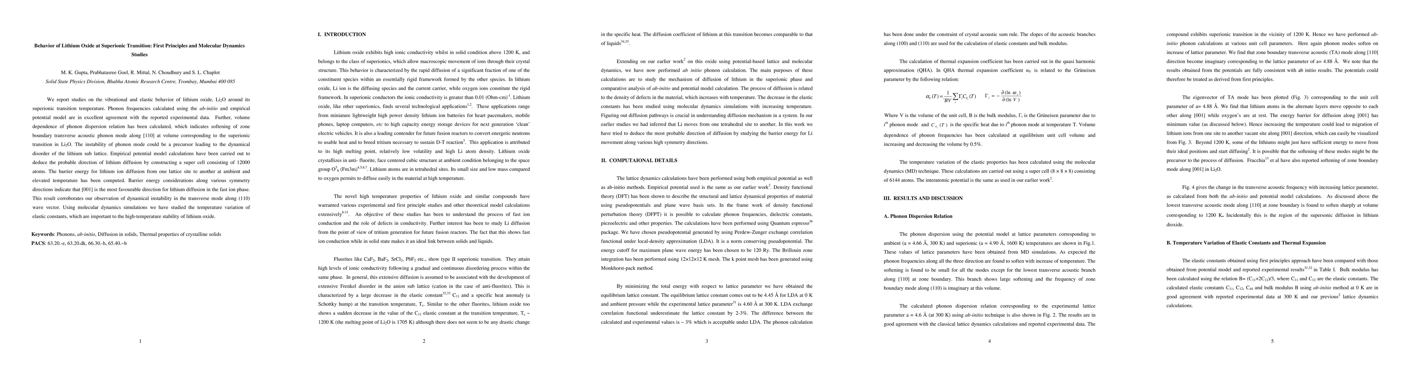 This study investigates the vibrational and elastic behavior of lithium oxide (Li2O) near its superionic transition using first principles and molecular dynamics simulations. The research finds that phonon softening along the [110] direction indicates a precursor to the dynamical disorder of the lithium sublattice, with [001] being the most favorable direction for lithium diffusion.