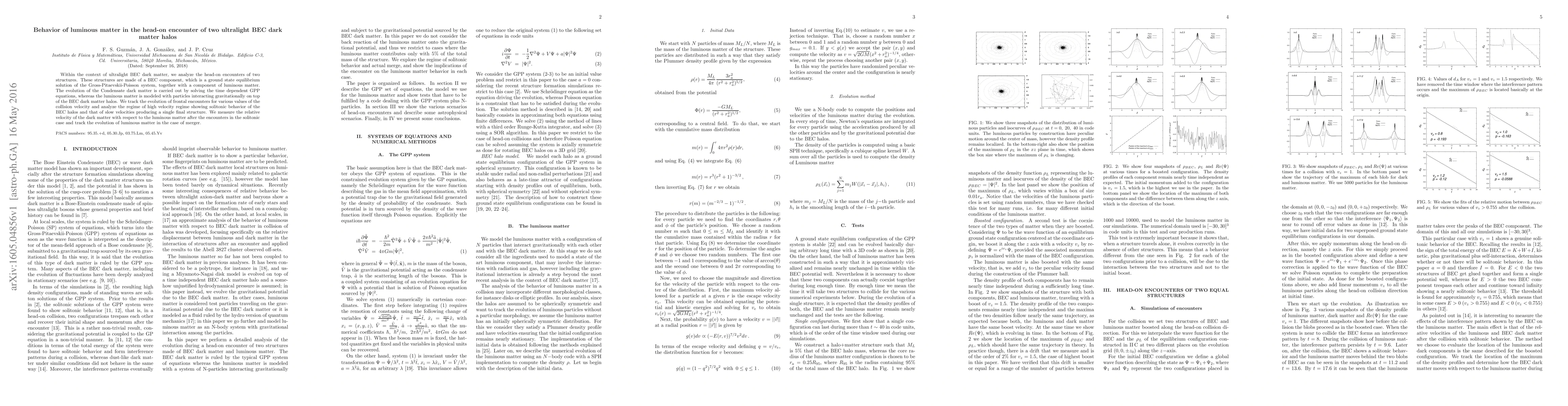 This paper investigates the behavior of luminous matter during head-on collisions of ultralight BEC dark matter halos, modeling the evolution of dark matter via Gross-Pitaevskii-Poisson equations and luminous matter through gravitational interactions. The study reveals solitonic behavior at high velocities and a merged structure at lower velocities.
