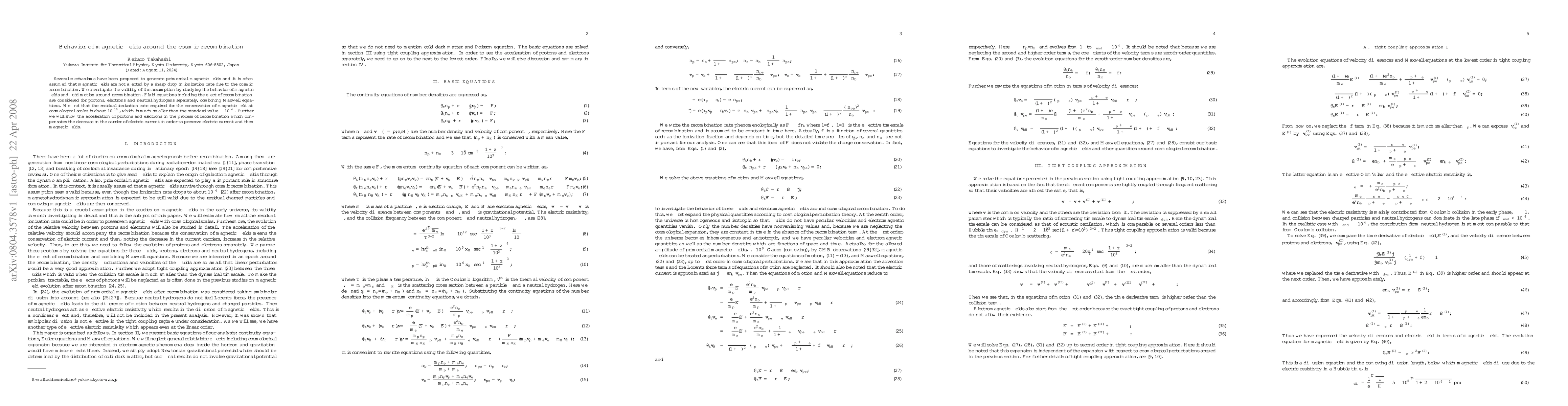 This paper investigates the behavior of magnetic fields during cosmic recombination, finding that a residual ionization rate of $10^{-10}$ is sufficient to conserve magnetic fields, much lower than previously assumed. It also demonstrates the acceleration of protons and electrons during recombination to maintain electric current and magnetic fields.