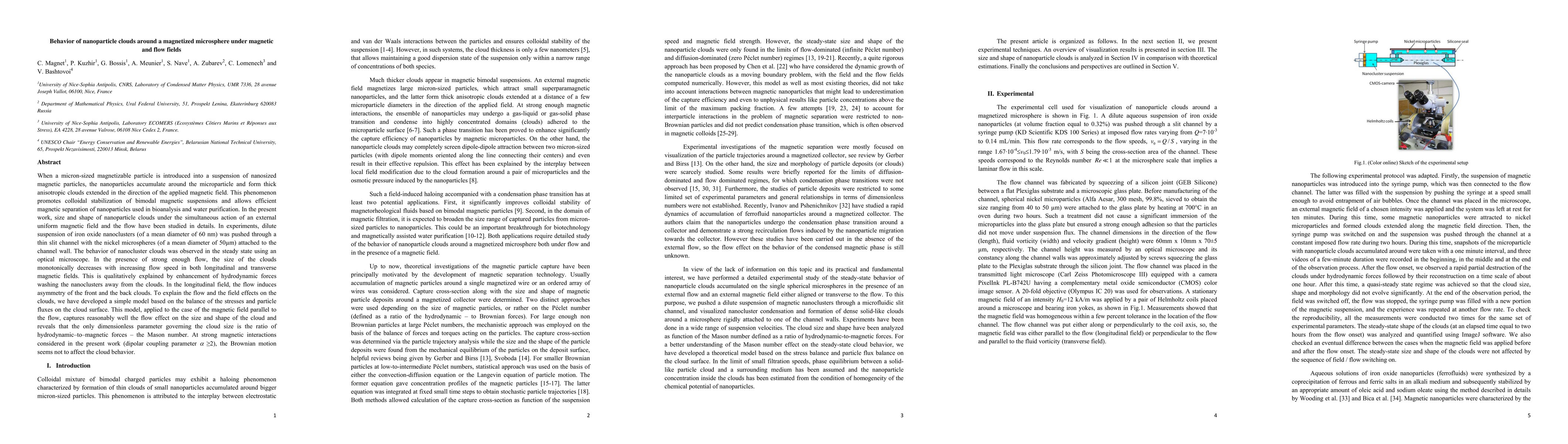 When a micron-sized magnetizable particle is introduced into a suspension of nanosized magnetic particles, the nanoparticles accumulate around the microparticle and form thick anisotropic clouds extended in the direction of the applied magnetic field. This phenomenon promotes colloidal stabilization of bimodal magnetic suspensions and allows efficient magnetic separation of nanoparticles used in bioanalysis and water purification. In the present work, size and shape of nanoparticle clouds under the simultaneous action of an external uniform magnetic field and the flow have been studied in details. In experiments, dilute suspension of iron oxide nanoclusters (of a mean diameter of 60 nm) was pushed through a thin slit channel with the nickel microspheres (of a mean diameter of 50$\mu$m) attached to the channel wall. The behavior of nanocluster clouds was observed in the steady state using an optical microscope. In the presence of strong enough flow, the size of the clouds monotonically decreases with increasing flow speed in both longitudinal and transverse magnetic fields. This is qualitatively explained by enhancement of hydrodynamic forces washing the nanoclusters away from the clouds. In the longitudinal field, the flow induces asymmetry of the front and the back clouds. To explain the flow and the field effects on the clouds, we have developed a simple model based on the balance of the stresses and particle fluxes on the cloud surface. This model, applied to the case of the magnetic field parallel to the flow, captures reasonably well the flow effect on the size and shape of the cloud and reveals that the only dimensionless parameter governing the cloud size is the ratio of hydrodynamic-to-magnetic forces - the Mason number. At strong magnetic interactions considered in the present work (dipolar coupling parameter $\alpha \geq 2$), the Brownian motion seems not to affect the cloud behavior.