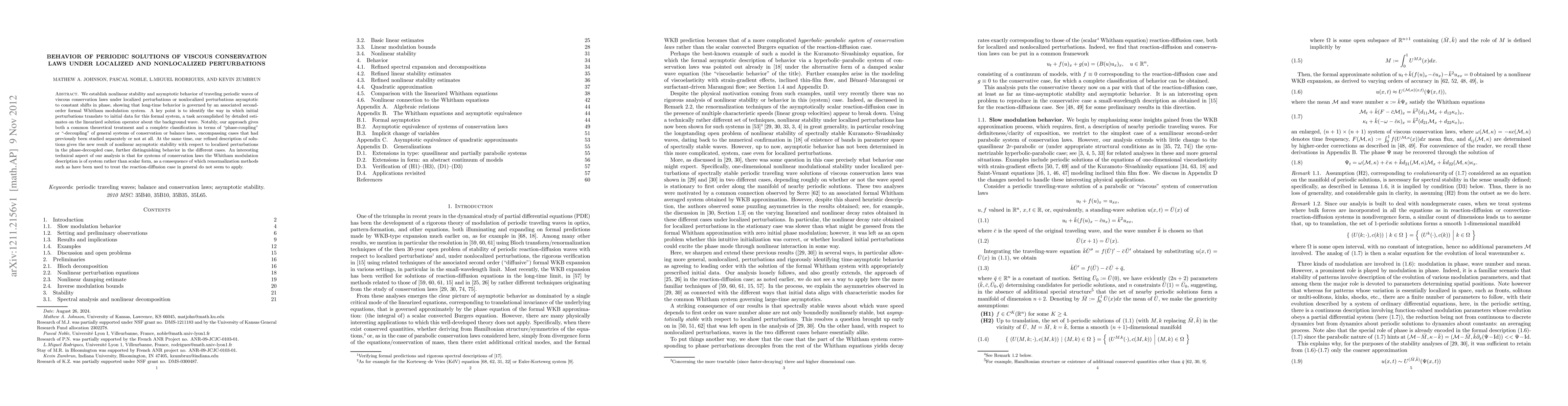 This paper investigates the stability and asymptotic behavior of traveling periodic waves in viscous conservation laws under various perturbations, revealing that long-term dynamics are dictated by a second-order Whitham modulation system. It provides a unified treatment and classification of conservation and balance laws, demonstrating nonlinear asymptotic stability under localized perturbations for phase-decoupled systems.