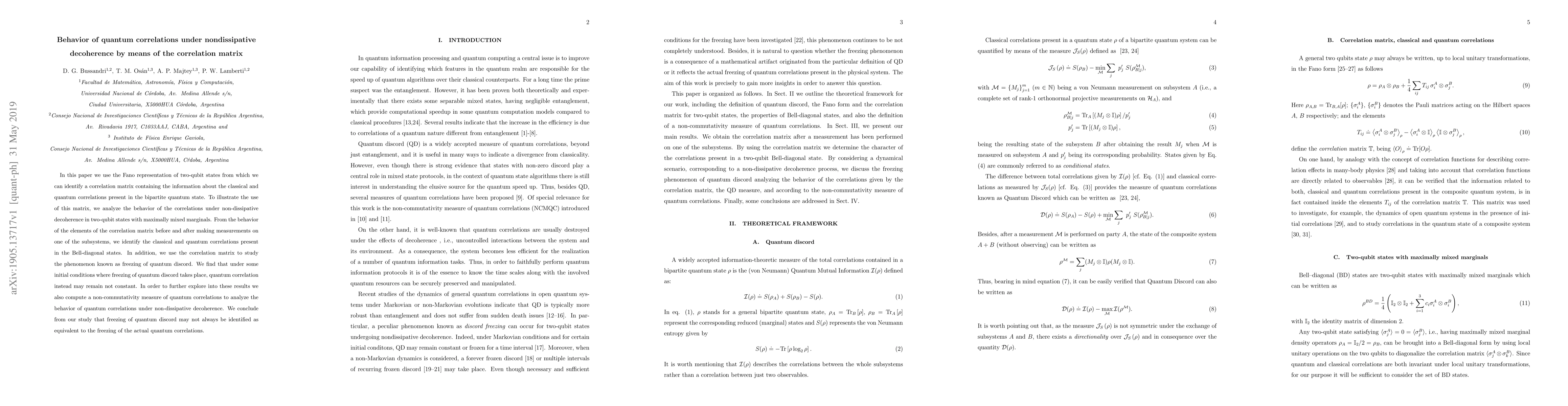 This paper investigates quantum correlations in two-qubit states using a correlation matrix derived from the Fano representation. It examines how these correlations behave under non-dissipative decoherence, revealing that quantum discord freezing does not necessarily equate to the freezing of quantum correlations.