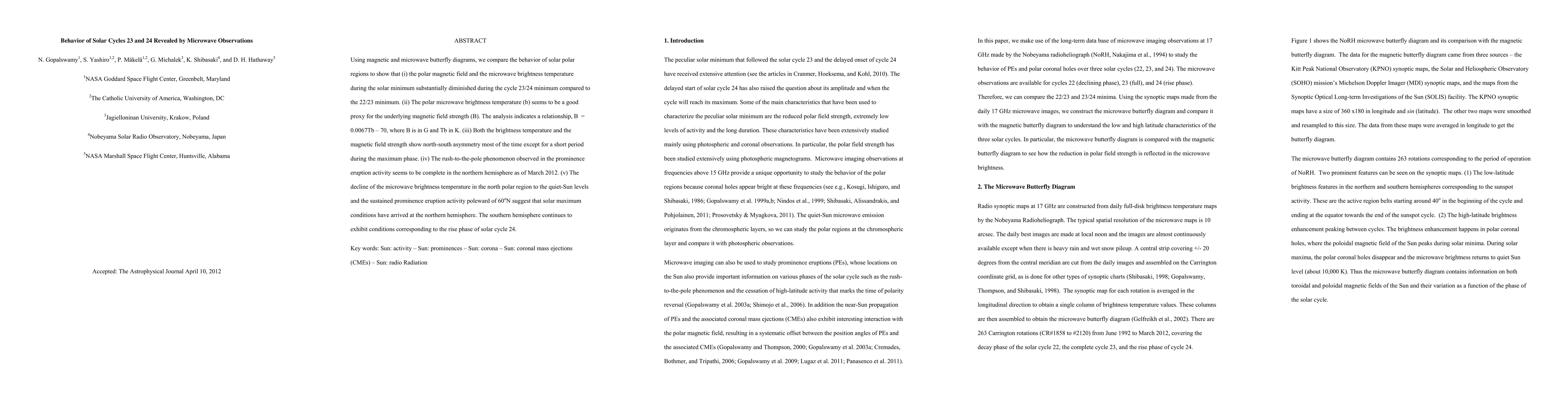 Using magnetic and microwave butterfly diagrams, we compare the behavior of solar polar regions to show that (i) the polar magnetic field and the microwave brightness temperature during the solar minimum substantially diminished during the cycle 23/24 minimum compared to the 22/23 minimum. (ii) The polar microwave brightness temperature (b) seems to be a good proxy for the underlying magnetic field strength (B). The analysis indicates a relationship, B = 0.0067Tb - 70, where B is in G and Tb in K. (iii) Both the brightness temperature and the magnetic field strength show north-south asymmetry most of the time except for a short period during the maximum phase. (iv) The rush-to-the-pole phenomenon observed in the prominence eruption activity seems to be complete in the northern hemisphere as of March 2012. (v) The decline of the microwave brightness temperature in the north polar region to the quiet-Sun levels and the sustained prominence eruption activity poleward of 60oN suggest that solar maximum conditions have arrived at the northern hemisphere. The southern hemisphere continues to exhibit conditions corresponding to the rise phase of solar cycle 24.