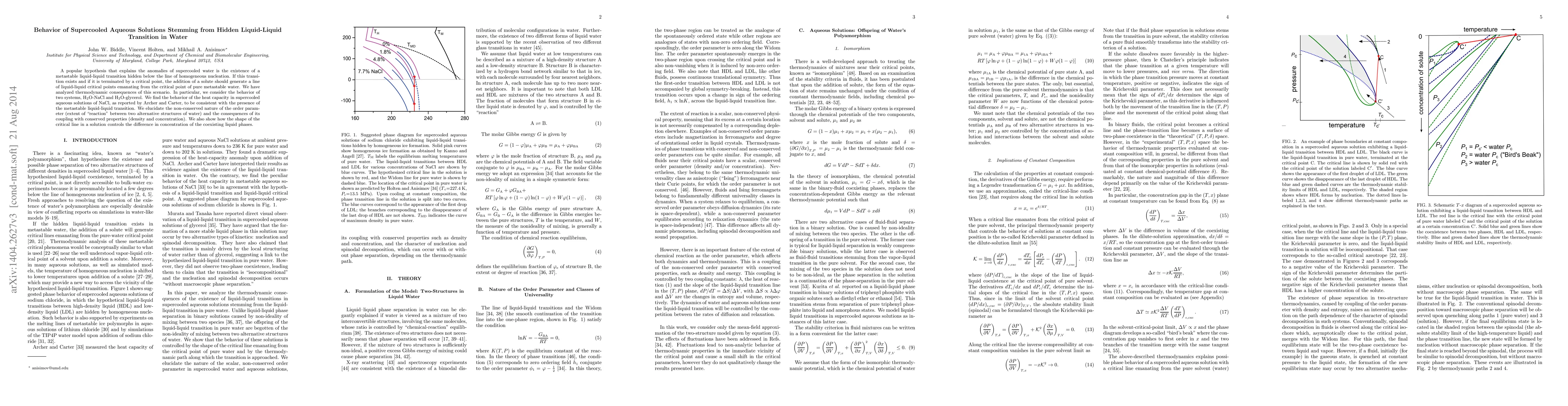 This paper explores the hypothesis of a hidden liquid-liquid transition in supercooled water, analyzing its thermodynamic implications in H2O-NaCl and H2O-glycerol systems. It finds evidence supporting the transition in NaCl solutions and provides a new interpretation for glycerol solutions, highlighting the unique behavior of spinodal decomposition without phase separation.