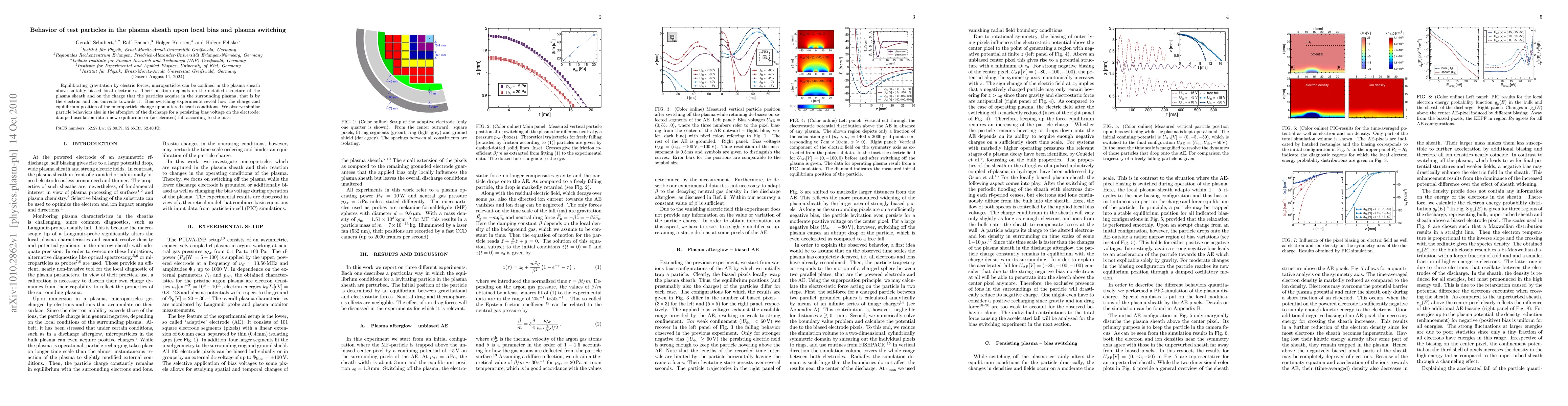 Equilibrating gravitation by electric forces, microparticles can be confined in the plasma sheath above suitably biased local electrodes.Their position depends on the detailed structure of the plasma sheath and on the charge that the particles acquire in the surrounding plasma, that is by the electron and ion currents towards it. Bias switching experiments reveal how the charge and equilibrium position of the microparticle change upon altered sheath conditions. We observe similar particle behaviors also in the afterglow of the discharge for a persisting bias voltage on the electrode: damped oscillation into a new equilibrium or (accelerated) fall according to the bias.