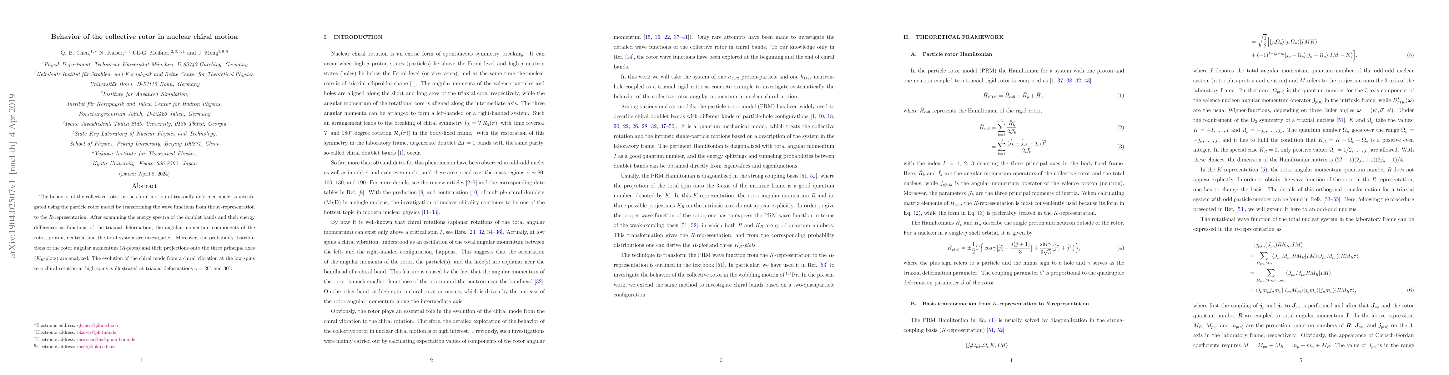 This paper investigates the collective rotor behavior in nuclear chiral motion using the particle rotor model, transforming wave functions to analyze the energy spectra and angular momentum in triaxially deformed nuclei. It illustrates the transition from chiral vibration to chiral rotation at high spins and analyzes $R$-plots and $K_R$-plots for angular momentum distributions.