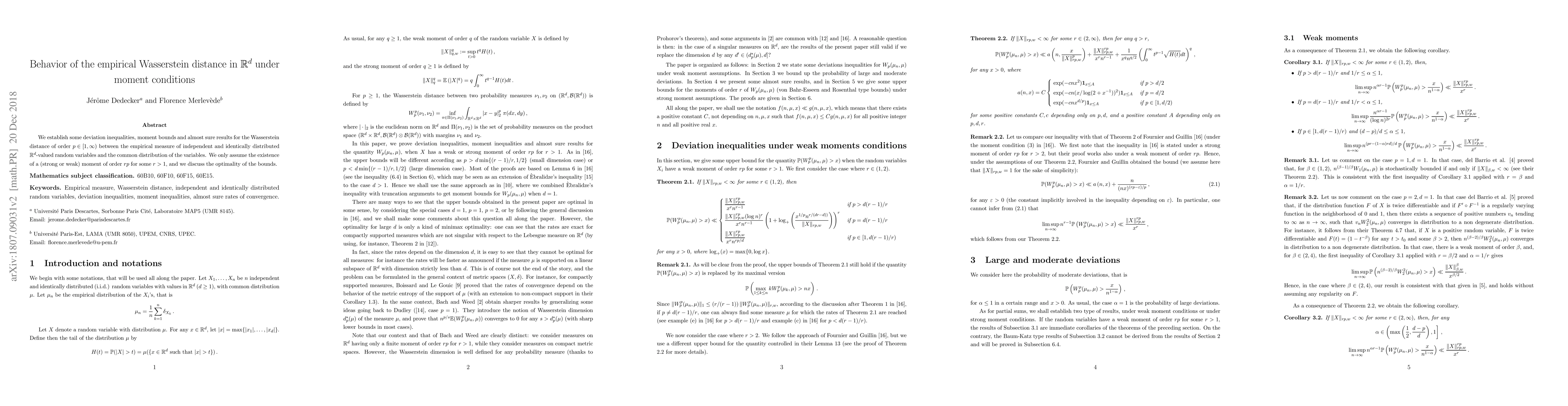 This paper investigates the behavior of the empirical Wasserstein distance in R^d under minimal moment conditions, establishing deviation inequalities, moment bounds, and almost sure convergence results, while discussing the optimality of these bounds. The study assumes the existence of a moment of order rp for some r > 1.