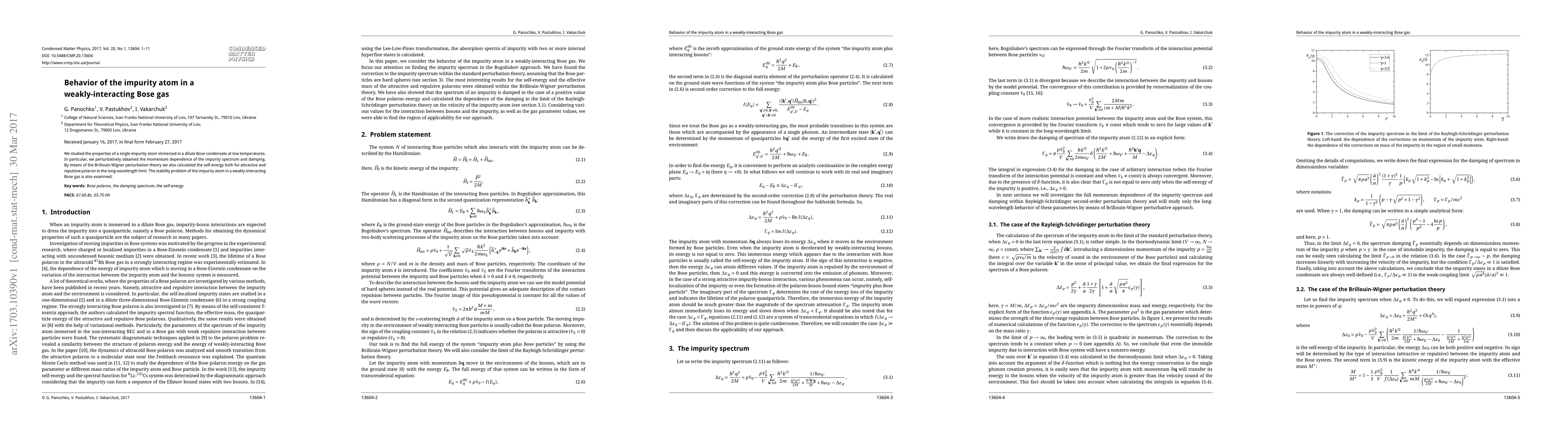 The paper presents a detailed analysis of impurity atom behavior in a Bose gas using advanced perturbation theories, providing explicit expressions for the spectrum and damping, as well as the self-energy and effective mass.