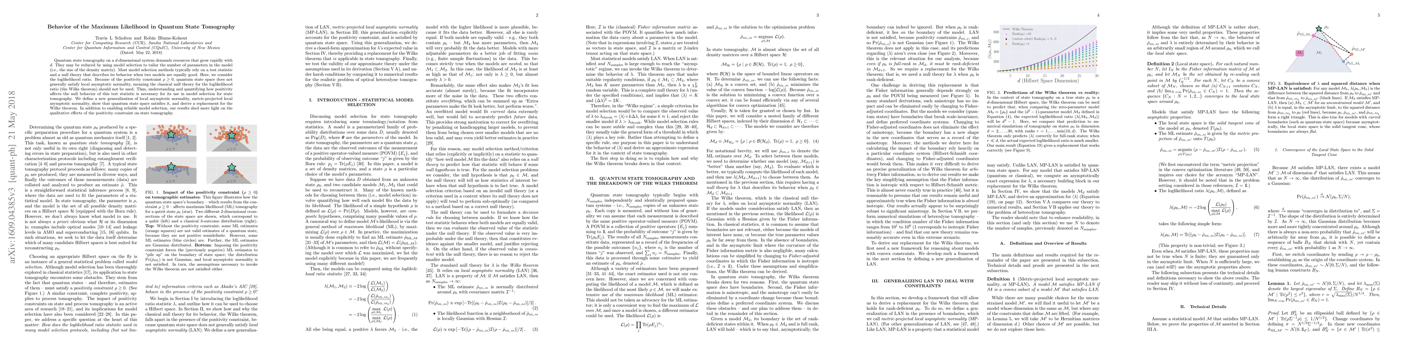 Quantum state tomography on a d-dimensional system demands resources that grow rapidly with d. They may be reduced by using model selection to tailor the number of parameters in the model (i.e., the size of the density matrix). Most model selection methods typically rely on a test statistic and a null theory that describes its behavior when two models are equally good. Here, we consider the loglikelihood ratio. Because of the positivity constraint $\rho \geq 0$, quantum state space does not generally satisfy local asymptotic normality, meaning the classical null theory for the loglikelihood ratio (the Wilks theorem) should not be used. Thus, understanding and quantifying how positivity affects the null behavior of this test statistic is necessary for its use in model selection for state tomography. We define a new generalization of local asymptotic normality, metric-projected local asymptotic normality, show that quantum state space satisfies it, and derive a replacement for the Wilks theorem. In addition to enabling reliable model selection, our results shed more light on the qualitative effects of the positivity constraint on state tomography.