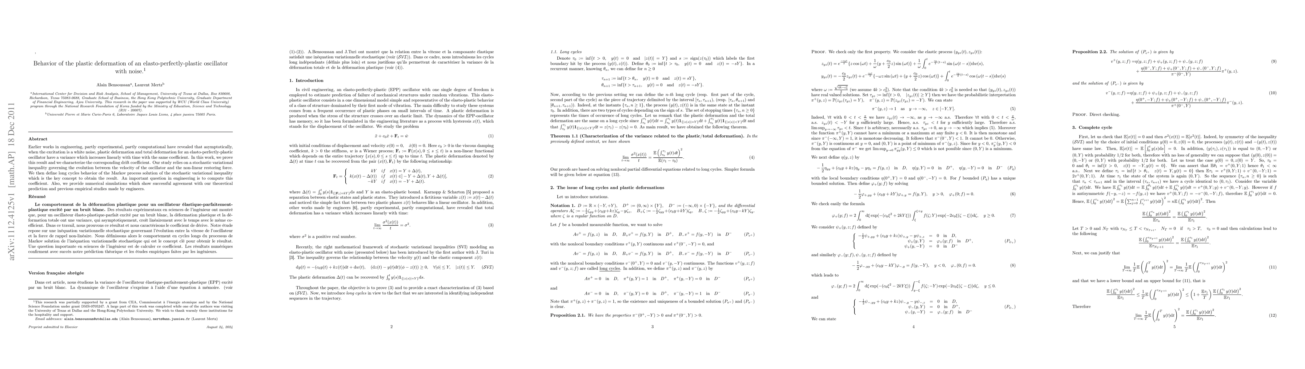 Earlier works in engineering, partly experimental, partly computational have revealed that asymptotically, when the excitation is a white noise, plastic deformation and total deformation for an elasto-perfectly-plastic oscillator have a variance which increases linearly with time with the same coefficient. In this work, we prove this result and we characterize the corresponding drift coefficient. Our study relies on a stochastic variational inequality governing the evolution between the velocity of the oscillator and the non-linear restoring force. We then define long cycles behavior of the Markov process solution of the stochastic variational inequality which is the key concept to obtain the result. An important question in engineering is to compute this coefficient. Also, we provide numerical simulations which show successful agreement with our theoretical prediction and previous empirical studies made by engineers.