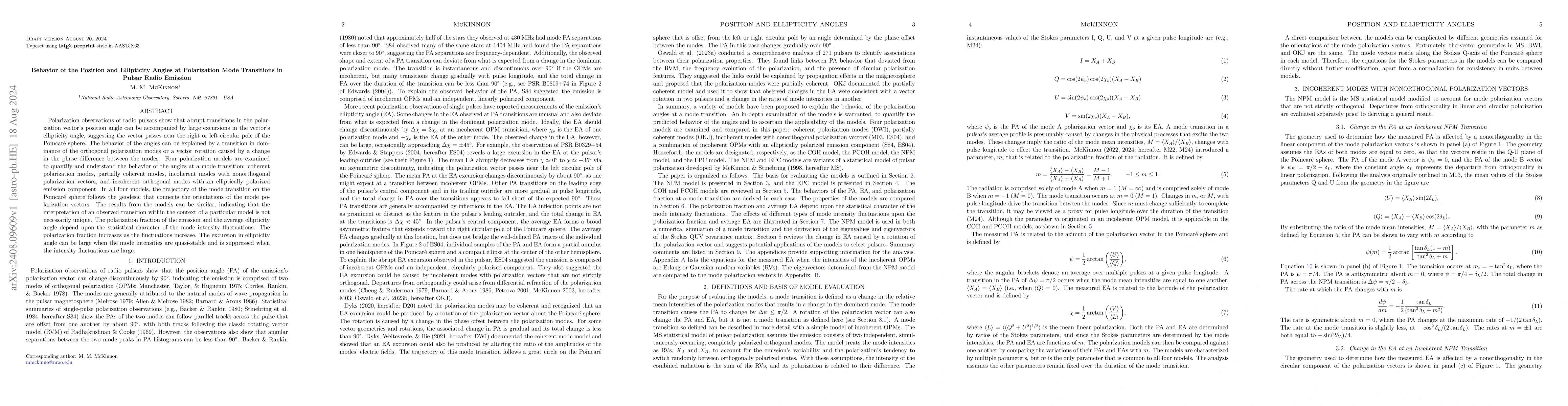Polarization observations of radio pulsars show that abrupt transitions in the polarization vector's position angle can be accompanied by large excursions in the vector's ellipticity angle, suggesting the vector passes near the right or left circular pole of the Poincar\'e sphere. The behavior of the angles can be explained by a transition in dominance of the orthogonal polarization modes or a vector rotation caused by a change in the phase difference between the modes. Four polarization models are examined to quantify and understand the behavior of the angles at a mode transition: coherent polarization modes, partially coherent modes, incoherent modes with nonorthogonal polarization vectors, and incoherent orthogonal modes with an elliptically polarized emission component. In all four models, the trajectory of the mode transition on the Poincar\'e sphere follows the geodesic that connects the orientations of the mode polarization vectors. The results from the models can be similar, indicating that the interpretation of an observed transition within the context of a particular model is not necessarily unique. The polarization fraction of the emission and the average ellipticity angle depend upon the statistical character of the mode intensity fluctuations. The polarization fraction increases as the fluctuations increase. The excursion in ellipticity angle can be large when the mode intensities are quasi-stable and is suppressed when the intensity fluctuations are large.
