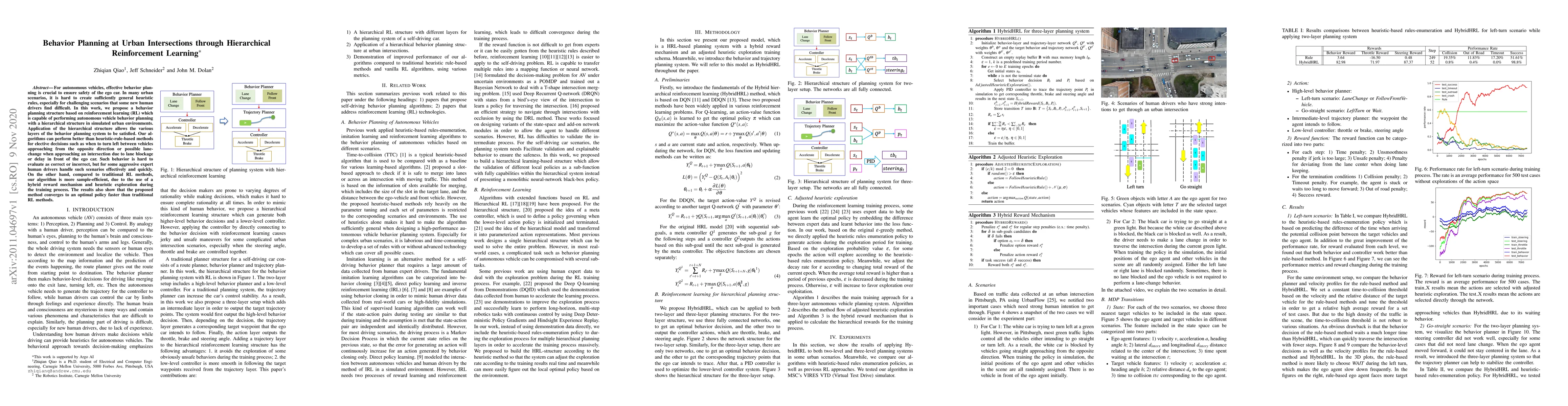 This paper proposes a hierarchical reinforcement learning approach for autonomous vehicle behavior planning at urban intersections, demonstrating improved sample efficiency and faster convergence compared to traditional RL methods, particularly in complex decision-making scenarios such as left turns and lane changes.