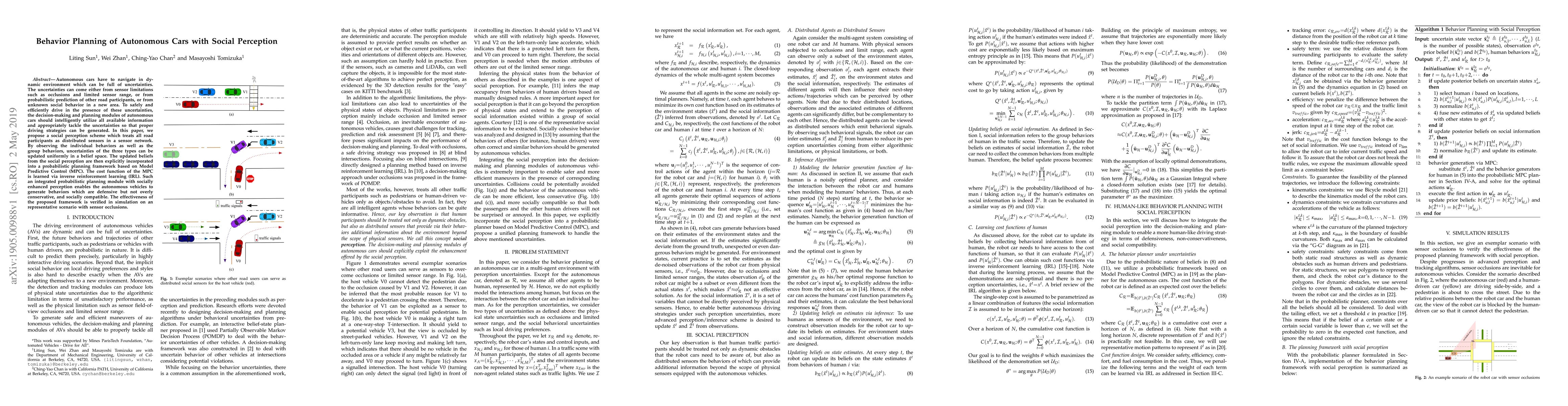 This paper proposes a social perception scheme for autonomous cars to tackle uncertainties in dynamic environments, incorporating individual and group behaviors into probabilistic planning using Model Predictive Control.