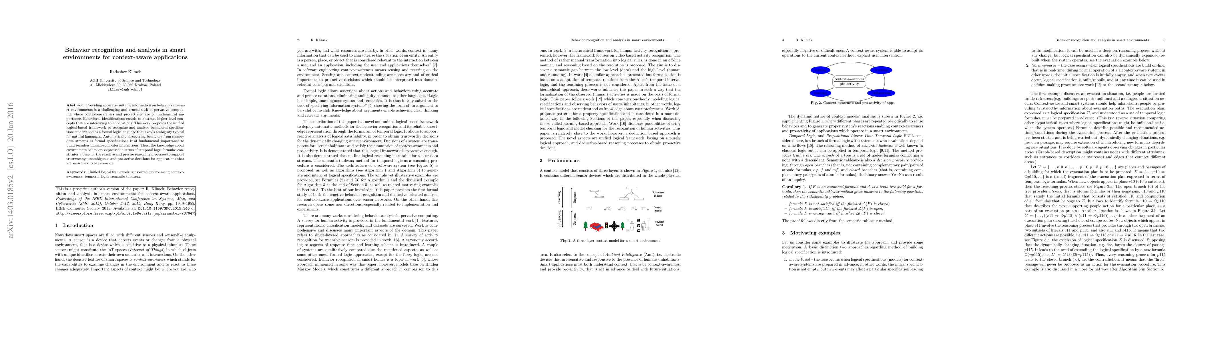 Providing accurate/suitable information on behaviors in sma\-rt environments is a challenging and crucial task in pervasive computing where context-awareness and pro-activity are of fundamental importance. Behavioral identifications enable to abstract higher-level concepts that are interesting to applications. This work proposes the unified logical-based framework to recognize and analyze behavioral specifications understood as a formal logic language that avoids ambiguity typical for natural languages. Automatically discovering behaviors from sensory data streams as formal specifications is of fundamental importance to build seamless human-computer interactions. Thus, the knowledge about environment behaviors expressed in terms of temporal logic formulas constitutes a base for the reactive and precise reasoning processes to support trustworthy, unambiguous and pro-active decisions for applications that are smart and context-aware.