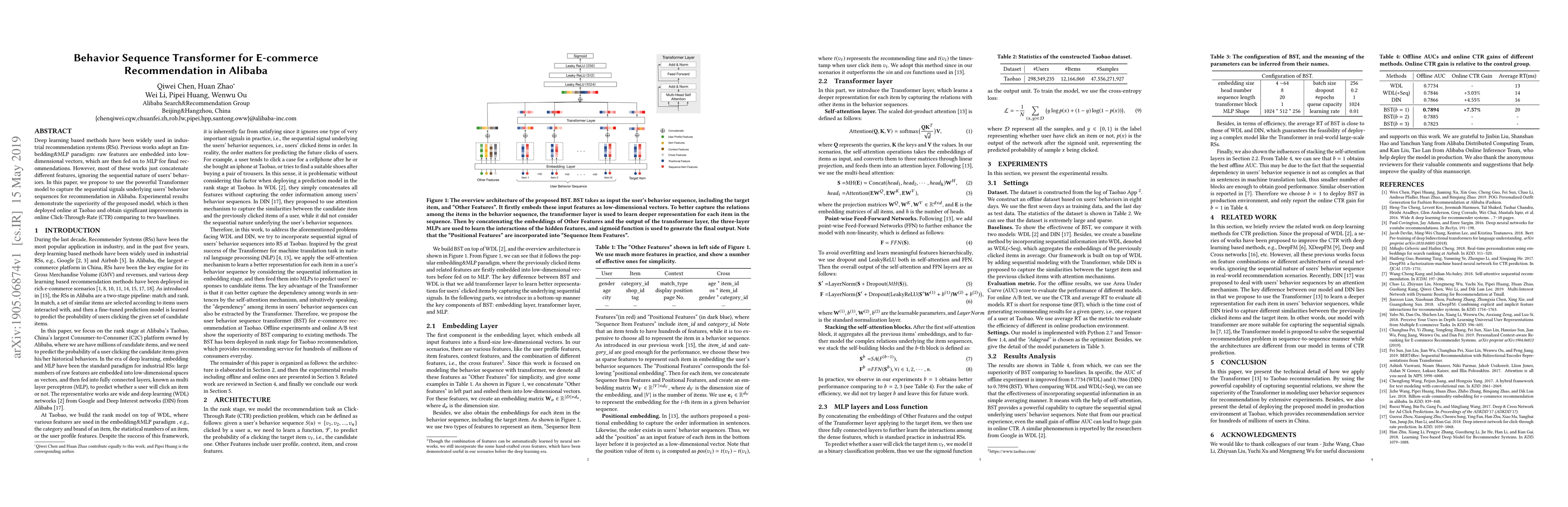 This paper proposes a Behavior Sequence Transformer model to enhance e-commerce recommendation systems by leveraging the sequential nature of user behaviors, achieving significant improvements in online Click-Through-Rate (CTR) over traditional Embedding&MLP methods. The model is deployed online at Taobao, demonstrating its effectiveness.