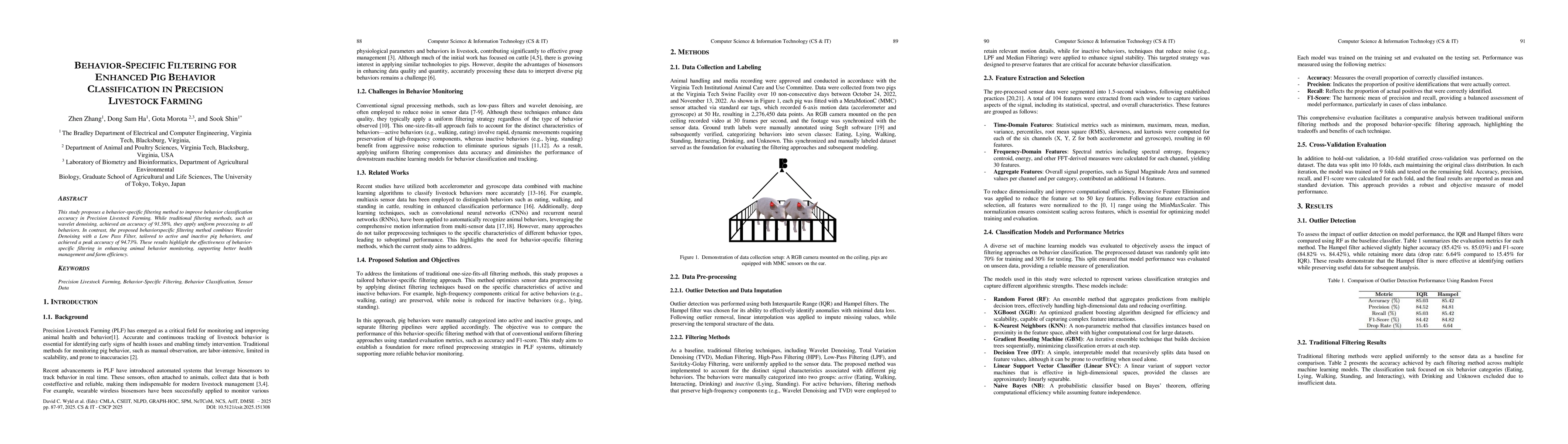 This research introduces a tailored filtering method for pig behaviors in Precision Livestock Farming, combining Wavelet Denoising and Low Pass Filter based on behavior type. It outperforms traditional methods, reaching up to 94.73% accuracy, enhancing behavior monitoring for improved animal health and farm efficiency.