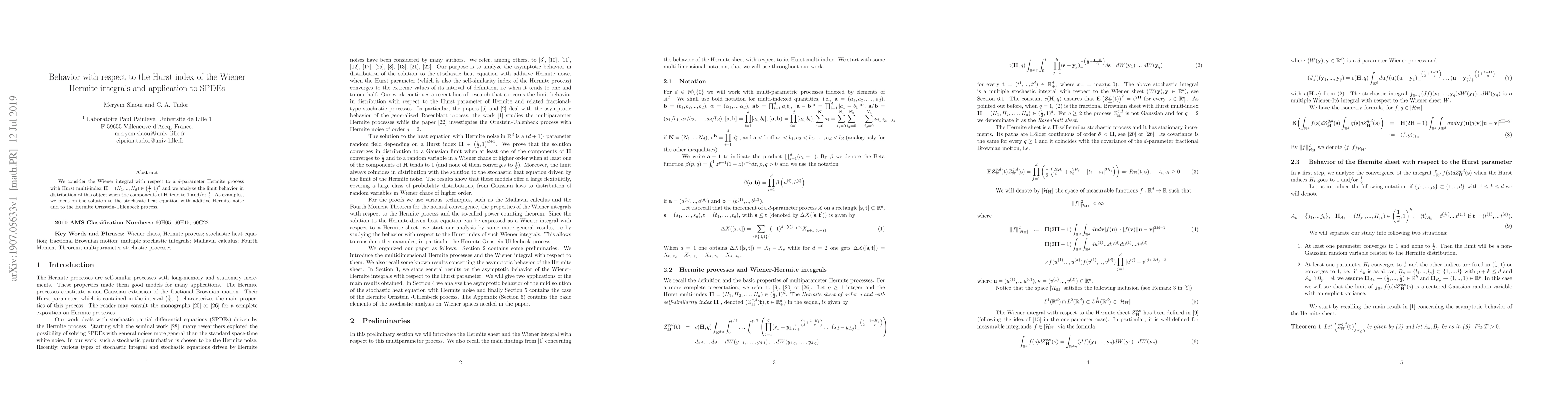 This paper investigates the behavior of Wiener Hermite integrals with respect to a $d$-parameter Hermite process and its limit distribution as the Hurst index approaches $1$ or $\frac{1}{2}$. It applies these findings to solutions of stochastic partial differential equations (SPDEs), specifically the stochastic heat equation and the Hermite Ornstein-Uhlenbeck process.