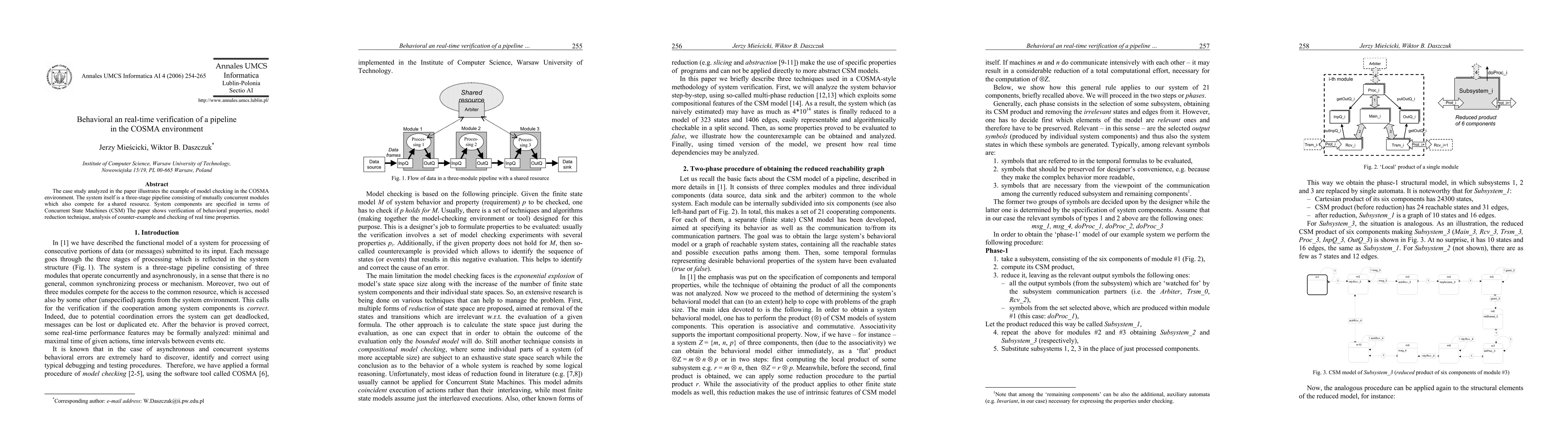 The case study analyzed in the paper illustrates the example of model checking in the COSMA environment. The system itself is a three-stage pipeline consisting of mutually concurrent modules which also compete for a shared resource. System components are specified in terms of Concurrent State Machines (CSM) The paper shows verification of behavioral properties, model reduction technique, analysis of counter-example and checking of real time properties.