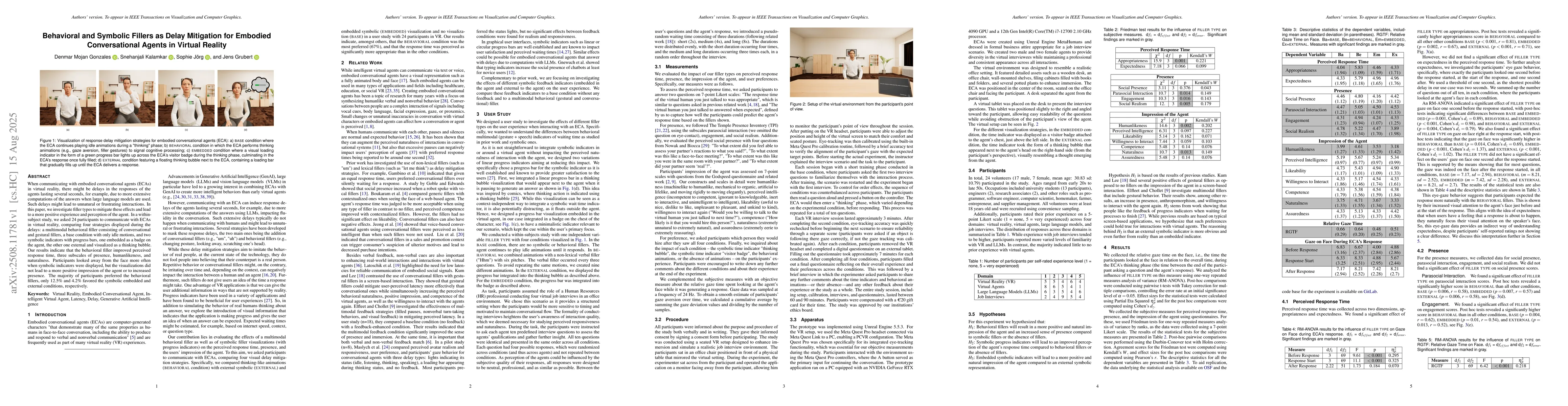 When communicating with embodied conversational agents (ECAs) in virtual reality, there might be delays in the responses of the agents lasting several seconds, for example, due to more extensive computations of the answers when large language models are used. Such delays might lead to unnatural or frustrating interactions. In this paper, we investigate filler types to mitigate these effects and lead to a more positive experience and perception of the agent. In a within-subject study, we asked 24 participants to communicate with ECAs in virtual reality, comparing four strategies displayed during the delays: a multimodal behavioral filler consisting of conversational and gestural fillers, a base condition with only idle motions, and two symbolic indicators with progress bars, one embedded as a badge on the agent, the other one external and visualized as a thinking bubble. Our results indicate that the behavioral filler improved perceived response time, three subscales of presence, humanlikeness, and naturalness. Participants looked away from the face more often when symbolic indicators were displayed, but the visualizations did not lead to a more positive impression of the agent or to increased presence. The majority of participants preferred the behavioral fillers, only 12.5% and 4.2% favored the symbolic embedded and external conditions, respectively.
