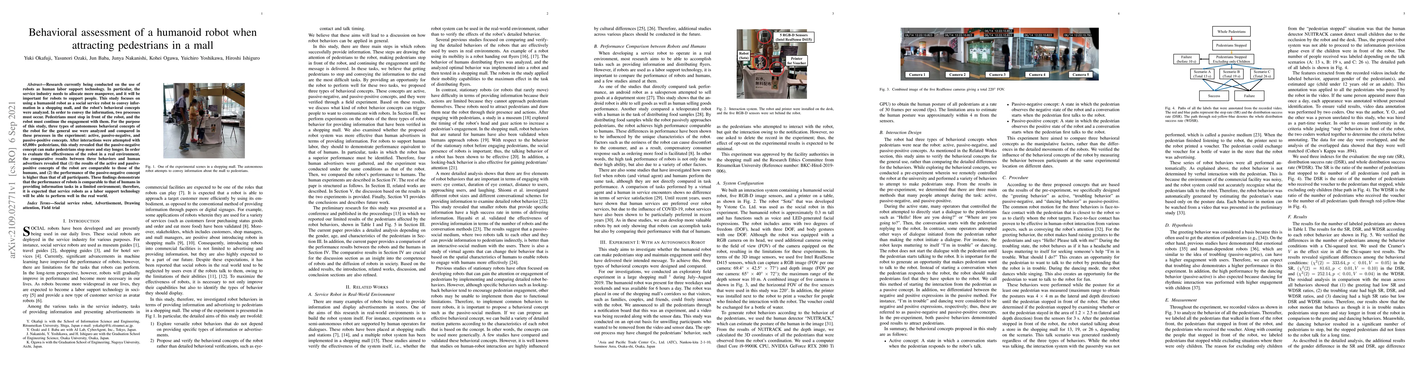 Research currently being conducted on the use of robots as human labor support technology. In particular, the service industry needs to allocate more manpower, and it will be important for robots to support people. This study focuses on using a humanoid robot as a social service robot to convey information in a shopping mall, and the robot's behavioral concepts were analyzed. In order to convey the information, two processes must occur. Pedestrians must stop in front of the robot, and the robot must continue the engagement with them. For the purpose of this study, three types of autonomous behavioral concepts of the robot for the general use were analyzed and compared in these processes in the experiment: active, passive-negative, and passive-positive concepts. After interactions were attempted with 65,000+ pedestrians, this study revealed that the passive-negative concept can make pedestrians stop more and stay longer. In order to evaluate the effectiveness of the robot in a real environment, the comparative results between three behaviors and human advertisers revealed that (1) the results of the active and passive-positive concepts of the robot are comparable to those of the humans, and (2) the performance of the passive-negative concept is higher than that of all participants. These findings demonstrate that the performance of robots is comparable to that of humans in providing information tasks in a limited environment; therefore, it is expected that service robots as a labor support technology will be able to perform well in the real world.
