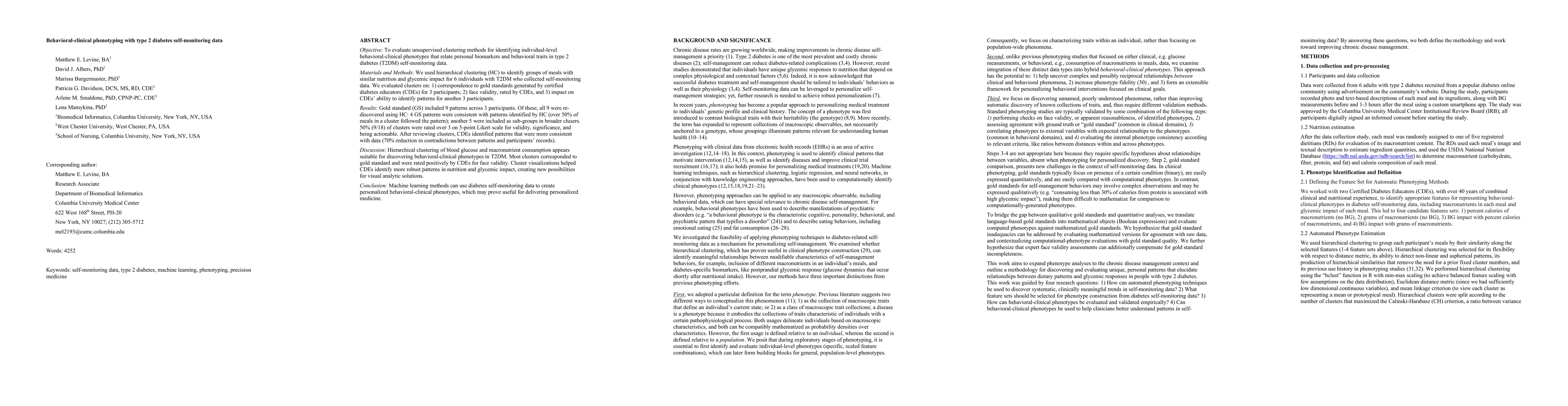 Objective: To evaluate unsupervised clustering methods for identifying individual-level behavioral-clinical phenotypes that relate personal biomarkers and behavioral traits in type 2 diabetes (T2DM) self-monitoring data. Materials and Methods: We used hierarchical clustering (HC) to identify groups of meals with similar nutrition and glycemic impact for 6 individuals with T2DM who collected self-monitoring data. We evaluated clusters on: 1) correspondence to gold standards generated by certified diabetes educators (CDEs) for 3 participants; 2) face validity, rated by CDEs, and 3) impact on CDEs' ability to identify patterns for another 3 participants. Results: Gold standard (GS) included 9 patterns across 3 participants. Of these, all 9 were re-discovered using HC: 4 GS patterns were consistent with patterns identified by HC (over 50% of meals in a cluster followed the pattern); another 5 were included as sub-groups in broader clusers. 50% (9/18) of clusters were rated over 3 on 5-point Likert scale for validity, significance, and being actionable. After reviewing clusters, CDEs identified patterns that were more consistent with data (70% reduction in contradictions between patterns and participants' records). Discussion: Hierarchical clustering of blood glucose and macronutrient consumption appears suitable for discovering behavioral-clinical phenotypes in T2DM. Most clusters corresponded to gold standard and were rated positively by CDEs for face validity. Cluster visualizations helped CDEs identify more robust patterns in nutrition and glycemic impact, creating new possibilities for visual analytic solutions. Conclusion: Machine learning methods can use diabetes self-monitoring data to create personalized behavioral-clinical phenotypes, which may prove useful for delivering personalized medicine.