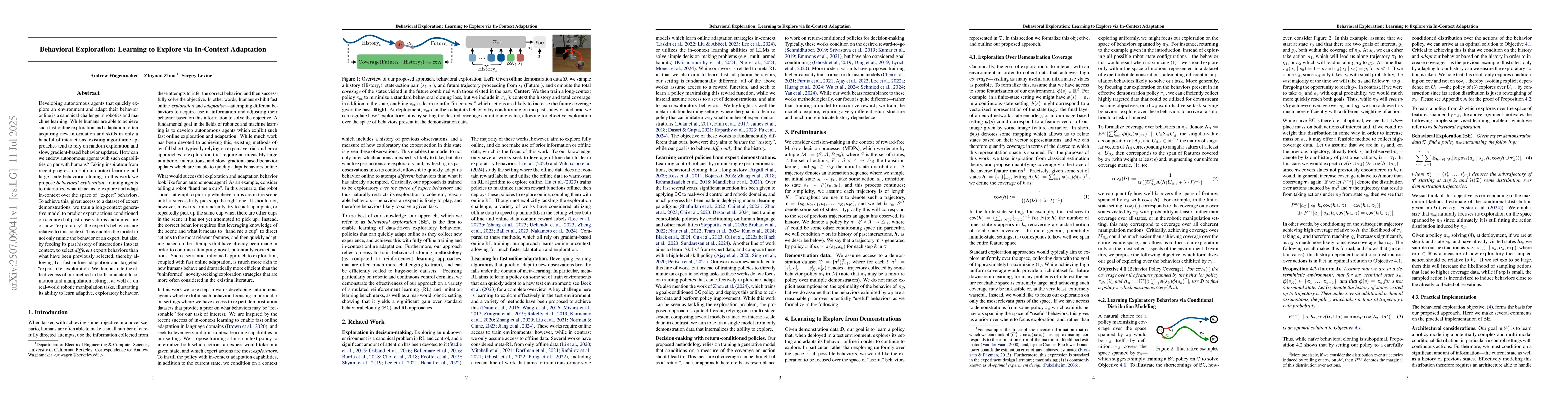 Developing autonomous agents that quickly explore an environment and adapt their behavior online is a canonical challenge in robotics and machine learning. While humans are able to achieve such fast online exploration and adaptation, often acquiring new information and skills in only a handful of interactions, existing algorithmic approaches tend to rely on random exploration and slow, gradient-based behavior updates. How can we endow autonomous agents with such capabilities on par with humans? Taking inspiration from recent progress on both in-context learning and large-scale behavioral cloning, in this work we propose behavioral exploration: training agents to internalize what it means to explore and adapt in-context over the space of ``expert'' behaviors. To achieve this, given access to a dataset of expert demonstrations, we train a long-context generative model to predict expert actions conditioned on a context of past observations and a measure of how ``exploratory'' the expert's behaviors are relative to this context. This enables the model to not only mimic the behavior of an expert, but also, by feeding its past history of interactions into its context, to select different expert behaviors than what have been previously selected, thereby allowing for fast online adaptation and targeted, ``expert-like'' exploration. We demonstrate the effectiveness of our method in both simulated locomotion and manipulation settings, as well as on real-world robotic manipulation tasks, illustrating its ability to learn adaptive, exploratory behavior.