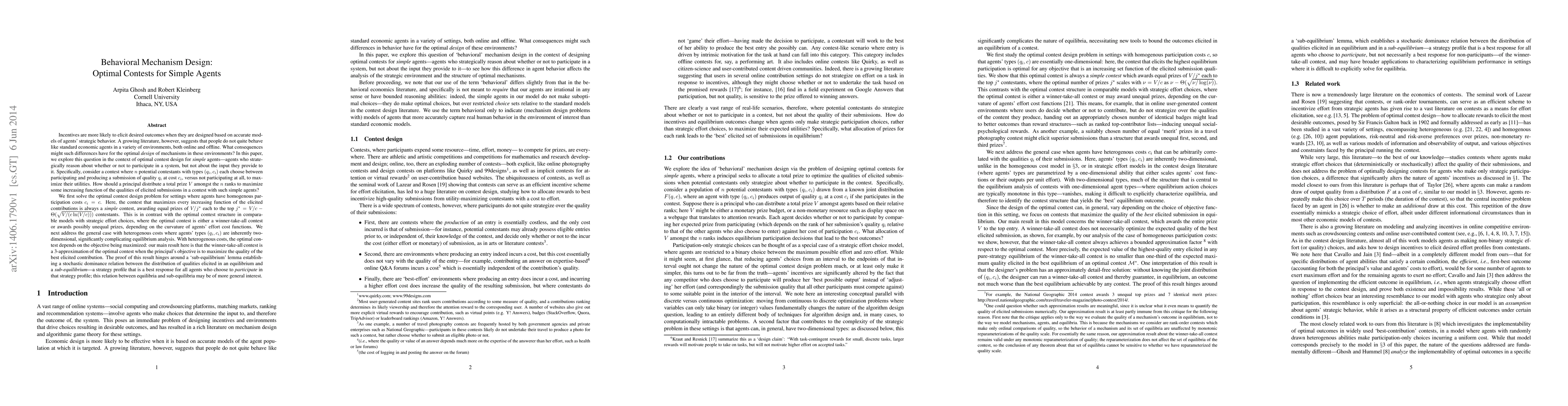 This paper investigates optimal contest design for simple agents who decide whether to participate but not how to input quality. It finds that for homogenous participation costs, the optimal contest awards equal prizes to the top contestants. For heterogeneous costs, the winner-take-all contest provides a 3-approximation of the optimal design when maximizing the quality of the best contribution.