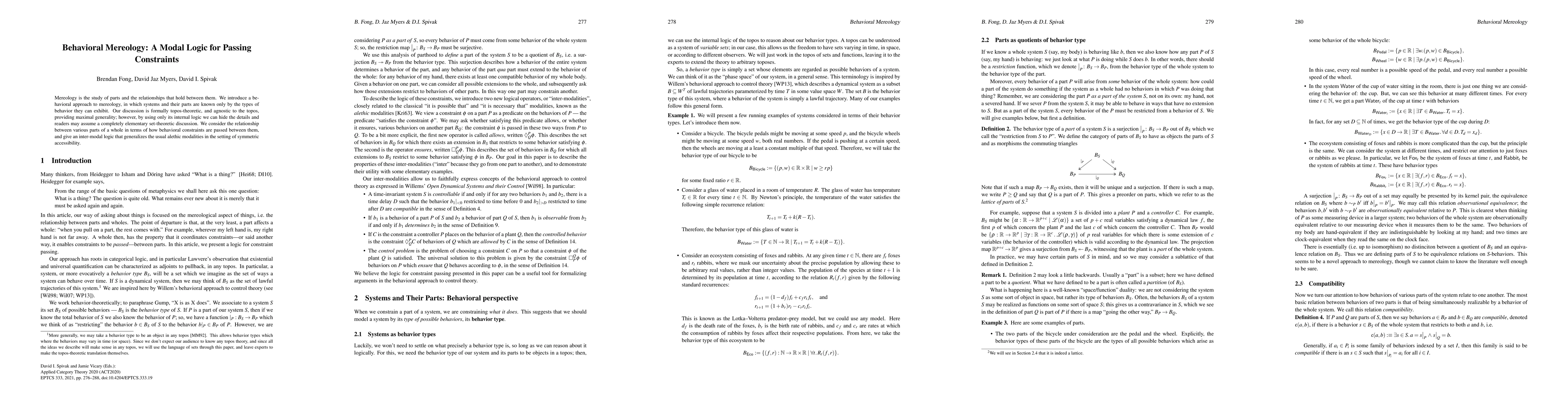 This paper introduces a new approach to mereology, focusing on behavioral constraints passed between parts of a whole, using an inter-modal logic that generalizes traditional modalities.