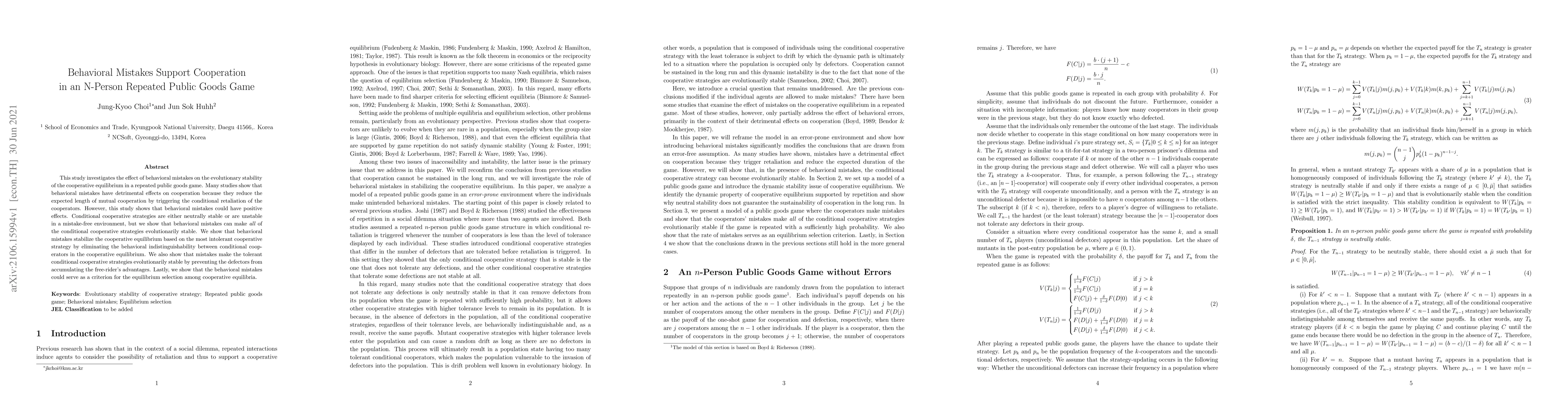 Behavioral mistakes can actually support cooperation in a repeated public goods game, stabilizing certain cooperative equilibria and making previously unstable strategies stable.